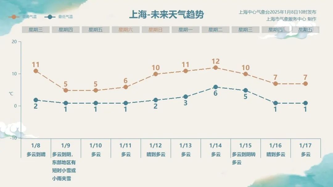 根据上海中心气象台消息,明天受冷空气前锋过境影响,申城云系增多。其中,崇明和浦东新区等东部沿海地区可能出现短时的小雪或小雨夹雪,范围小、时间短、强度弱,总体对大家出行影响不大。不过气温受到冲击大跳水,开启“速冻”模式,全天最高气温不超过5℃,再加上北风呼啸,体感一个字:冷!