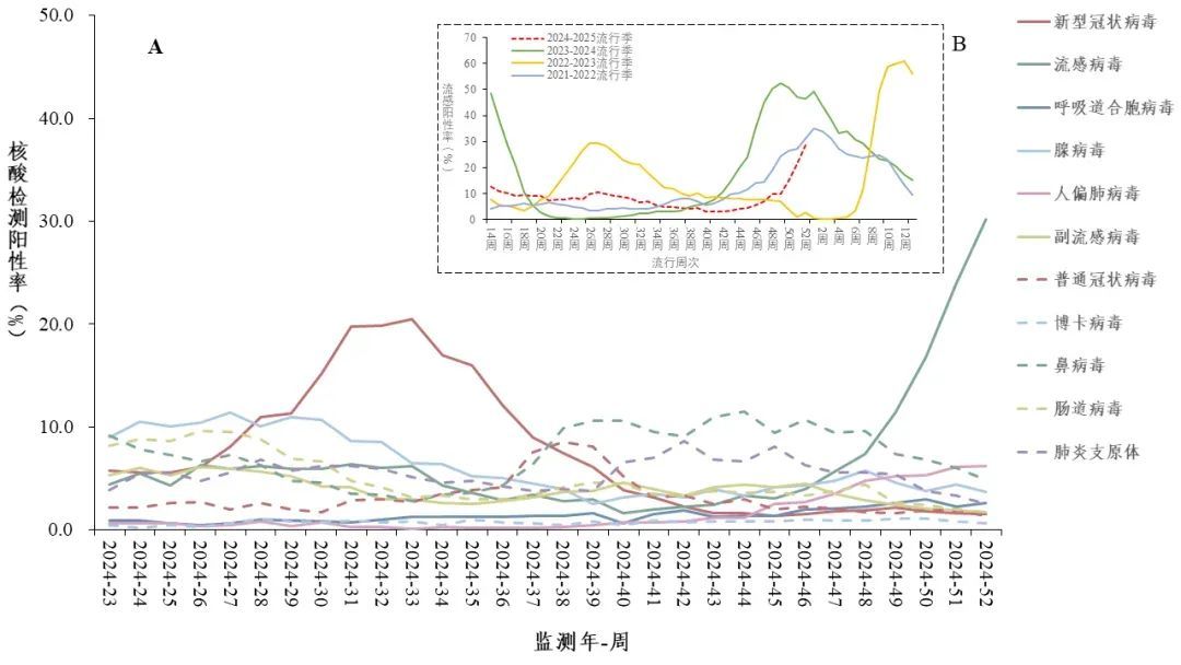 哨点医院门急诊流感样病例呼吸道样本病原体核酸检测阳性率每周变化趋势