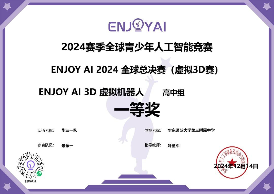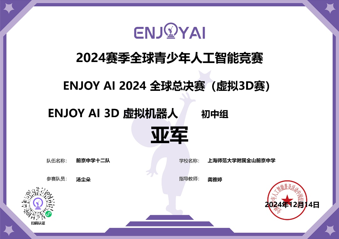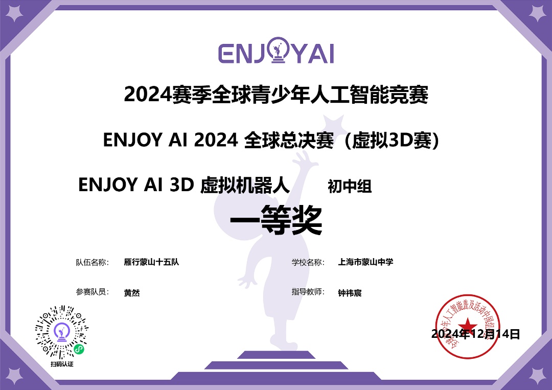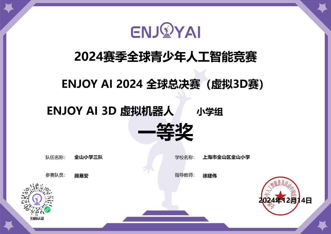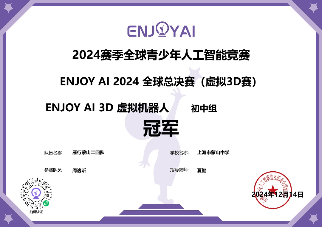 国际赛场上,在12月14日举行的“2024赛季全球青少年人工智能竞赛ENJOY AI2024全球总决赛”虚拟机器人项目中,我区40余名学生脱颖而出,斩获1项冠军、1项亚军、23项一等奖、12项二等奖和3项三等奖的优异成绩