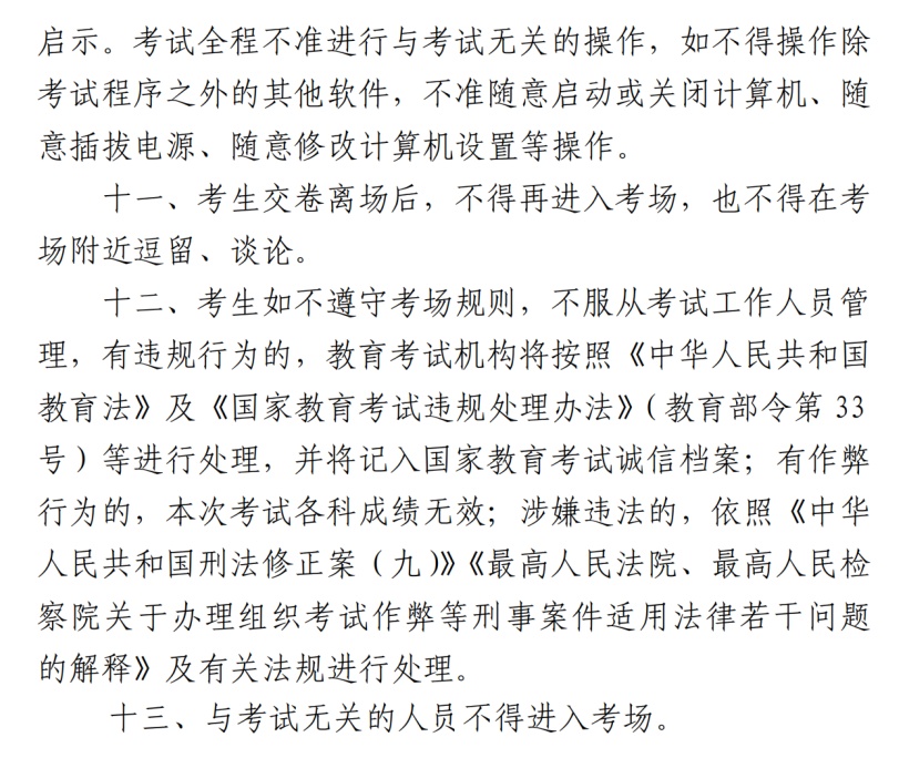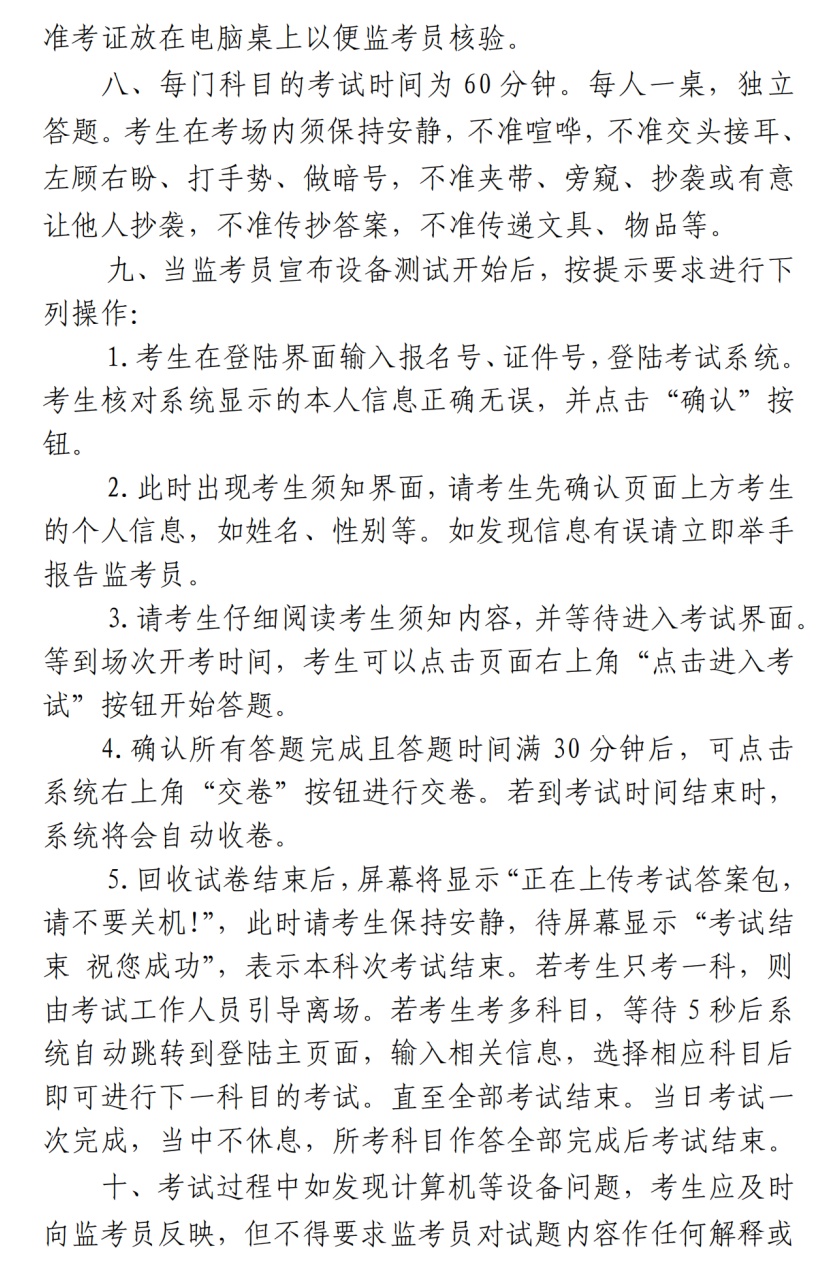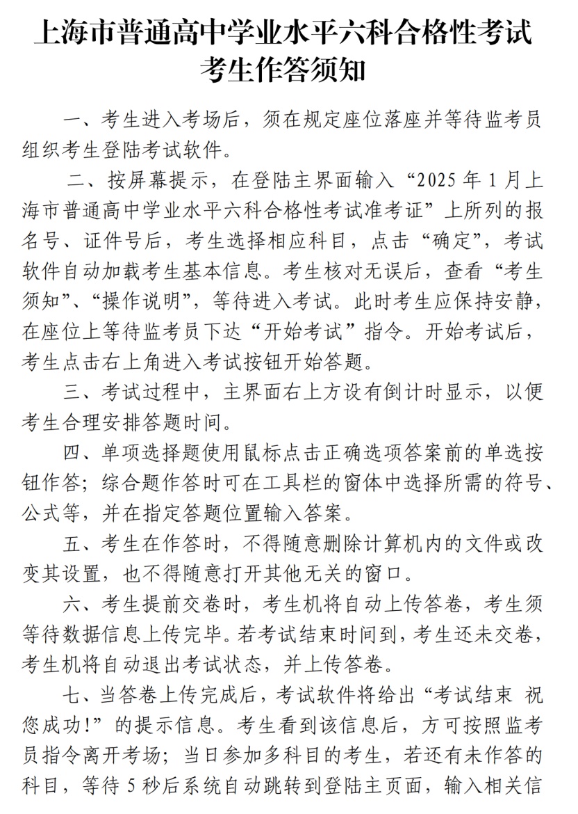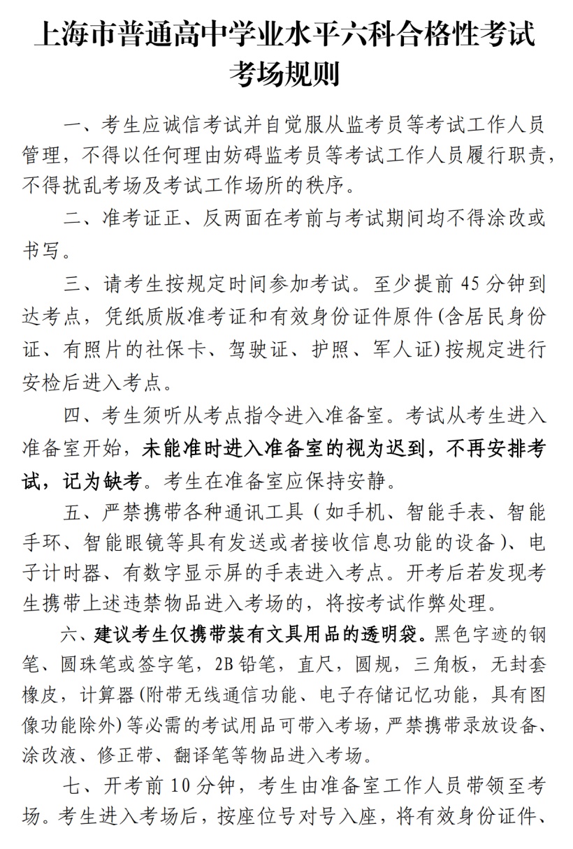 2025年1月上海市普通高中学业水平六科合格性考试将于1月11日至12日举行。本次考试采用上机考试的形式,考试科目、时间安排及注意事项详见↓ 注:具体考试时间以准考证为准。 为确保考生顺利参加考试,上海市教育考试院提醒以下注意事项: 一、做好考试准备 1.考生须携带本人当天考试科目准考证和有效身份证件原件(含居民身份证、有照片的社保卡、驾驶证、护照、军人证),严格按照准考证上的规定时间和考点参加考试,请仔细阅读准考证上的说明和要求,妥善保管好准考证,准考证正、反两面在考前与考试期间均不得涂改或书写。 2.请广大考生和家长充分考虑考试期间的交通、天气等因素,合理规划赴考时间,考前45分钟开始有序进入考点,配合考试工作人员完成考点入口处的安检工作。 考试从考生进入准备室开始,未能准时进入准备室的视为迟到,不再安排考试,记为缺考。 二、遵守考试规则 3.本次考试实行考点和准备室“二次安检”,为方便快速通过安全检查,请考生事先准备透明文具袋、透明资料袋,仅携带考试必需的文具等考试用品。 进入考点和准备室时,禁止携带手机、智能手表、智能手环、智能眼镜、蓝牙耳机等具有发送和接收信息功能的工具,以及电子计时器、有数字显示屏的手表、涂改液、修正带、翻译笔等物品。建议将手机等上述物品放于家中或交由送考家长或老师保管。 申请合理便利的残疾考生所携带的助听器、人工耳蜗、拐杖、轮椅等可经检查后正常通过安检。 请考生听从考点工作人员管理,共同维护考点工作秩序和安全。 4.请考生仔细阅读《上海市普通高中学业水平六科合格性考试考场规则》(详见文末)和《上海市普通高中学业水平六科合格性考试考生作答须知》(详见文末),严格按照考场规则参加考试。考试期间若有违规、违法行为,将参照《国家教育考试违规处理办法》(教育部令第33号)(摘要)、《中华人民共和国刑法修正案(九)》(摘要)严肃处理。 三、放松心态应考 5.考前及考试期间,做好健康防护;保持正常饮食和作息习惯,注意食品卫生;注意天气变化,调整心态,放松心情。 6.考试结束,考生应听从考点指挥,带好随身物品,有序快速离场,切勿滞留考点。 7.送考家长在考点周边应避免聚集,服从考点工作人员和警务人员指挥,考试期间应确保手机畅通。 点击“阅读原文”查看详情↓