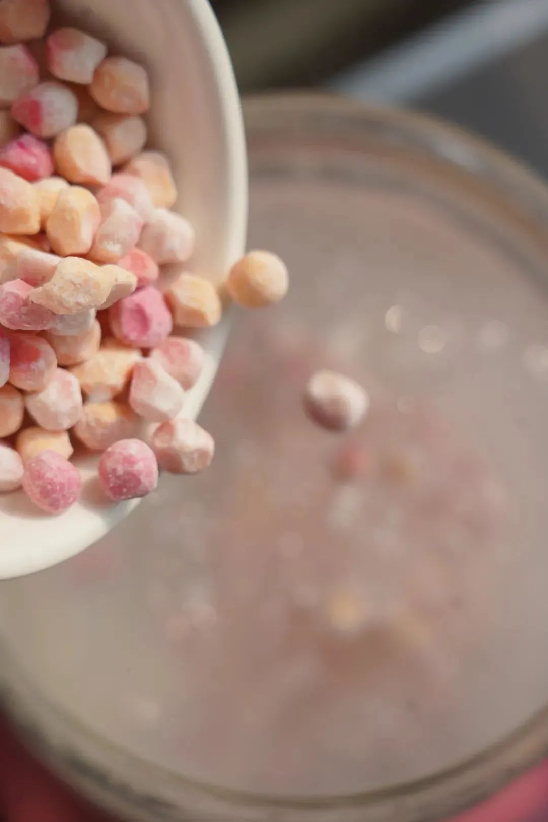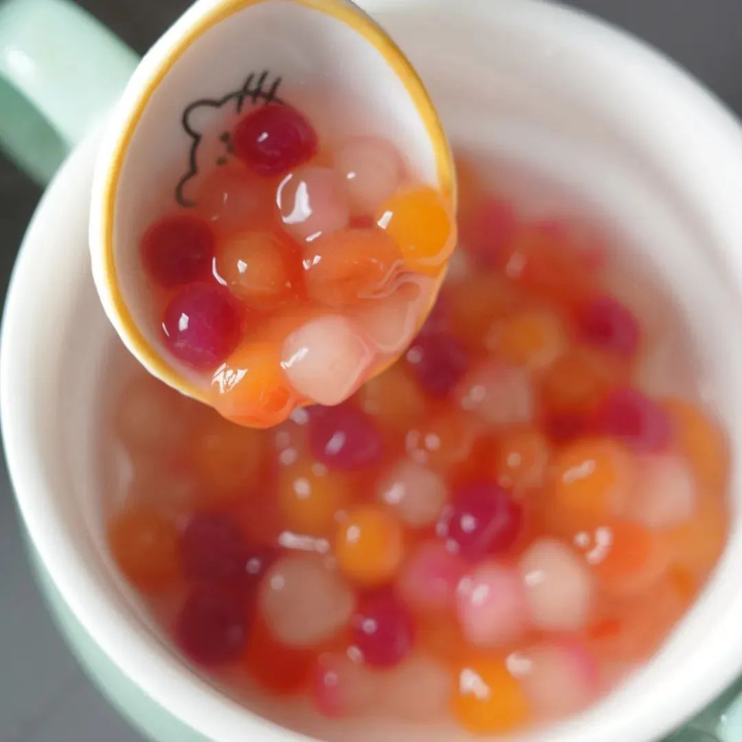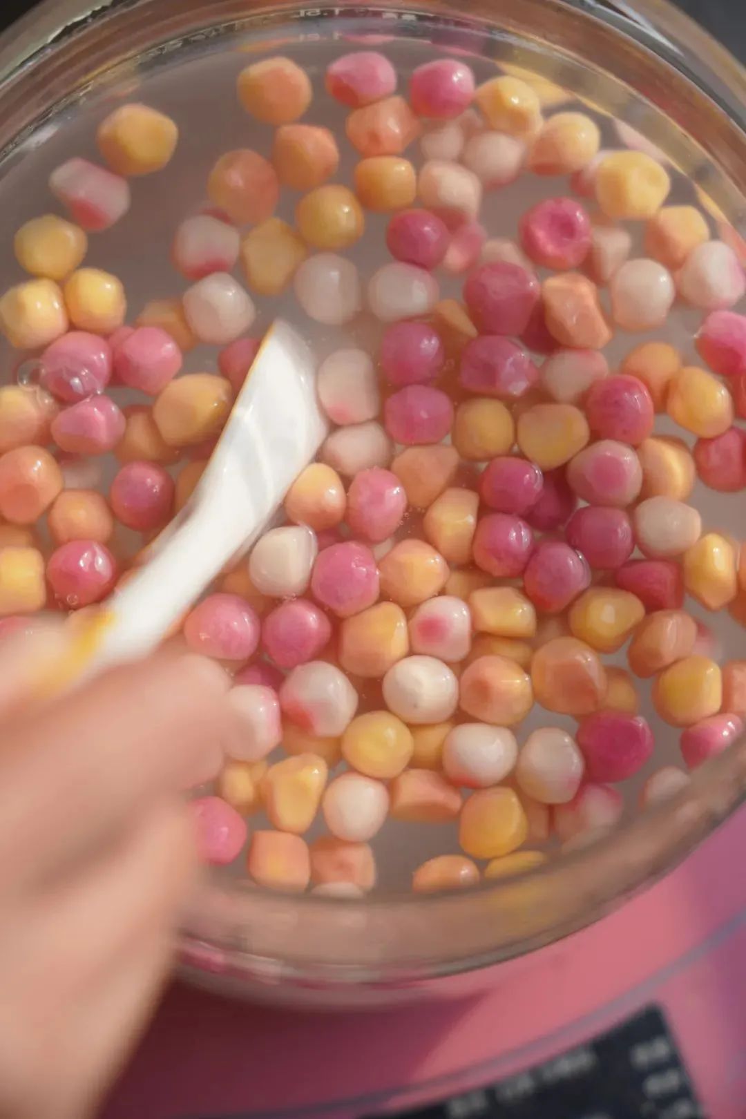 第三步:趁着这个时间可以来处理芋圆。锅中倒入适量清水,水沸腾后,放入芋圆,慢慢搅拌至芋圆全部浮起,盖上锅盖煮8分钟后关火,再焖5分钟即可。