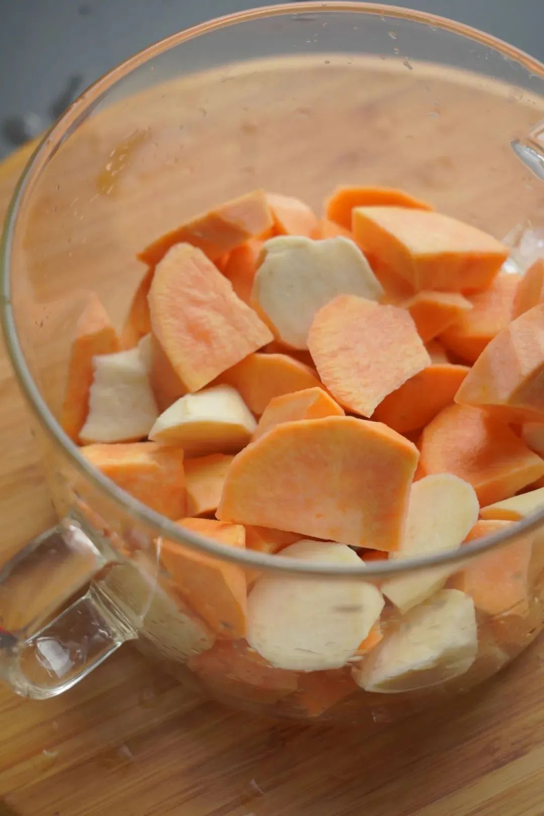 第一步:洗净红薯和白薯表面的泥土,用刨刀去皮后,切成小块。