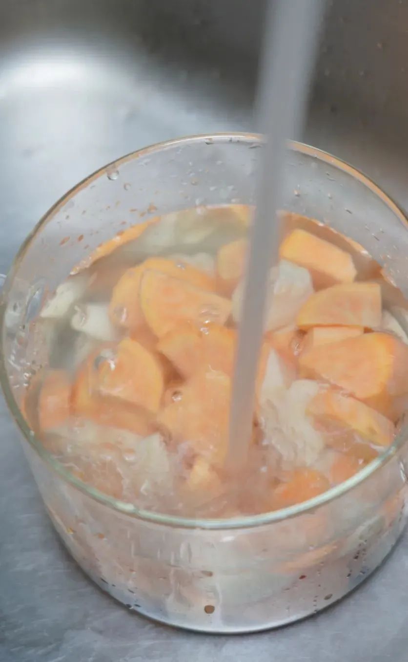 第二步:将切好的红薯块和白薯块放进清水中浸泡5分钟,这样后续煮出来的汤色会更加清澈透亮。