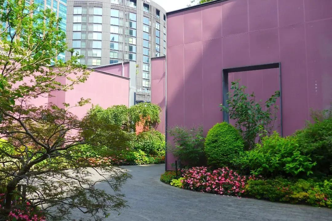 公园外部是以艺术化绿墙为背景的街角空间,内部则栽植小乔木、灌木、草花、观赏草等,呈现出淡雅精致的城市花境庭院。漫步其中,微风拂面,让人感受到别样的惬意与悠闲。
