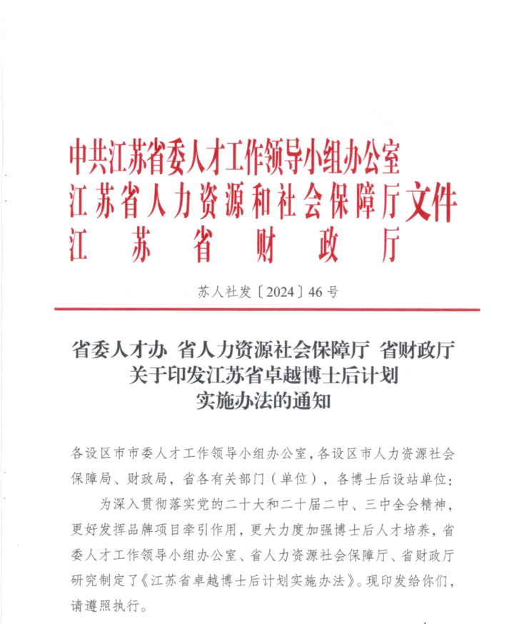江苏省委人才办、省人社厅、省财政厅近日联合出台《江苏省卓越博士后计划》,聚焦新质生产力,持续优化“卓博计划”,把原先每人30万元的资助方式调整为A、B、C三档,其中A档每人50万元,资助200人;B档每人30万元,资助300人;C档每人20万元,资助400人。资助期为2年。
