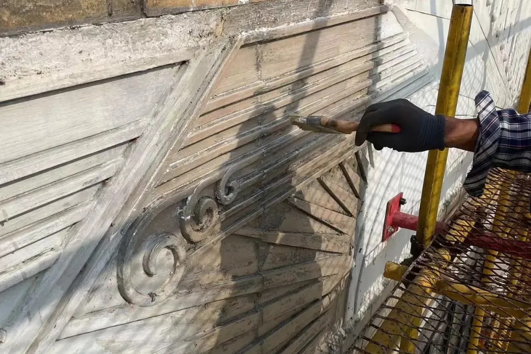 在修复过程中,团队始终认真考证原始设计资料及施工工艺,重点保护部位、细部等应严格按原式样、原材质、原工艺进行修缮。