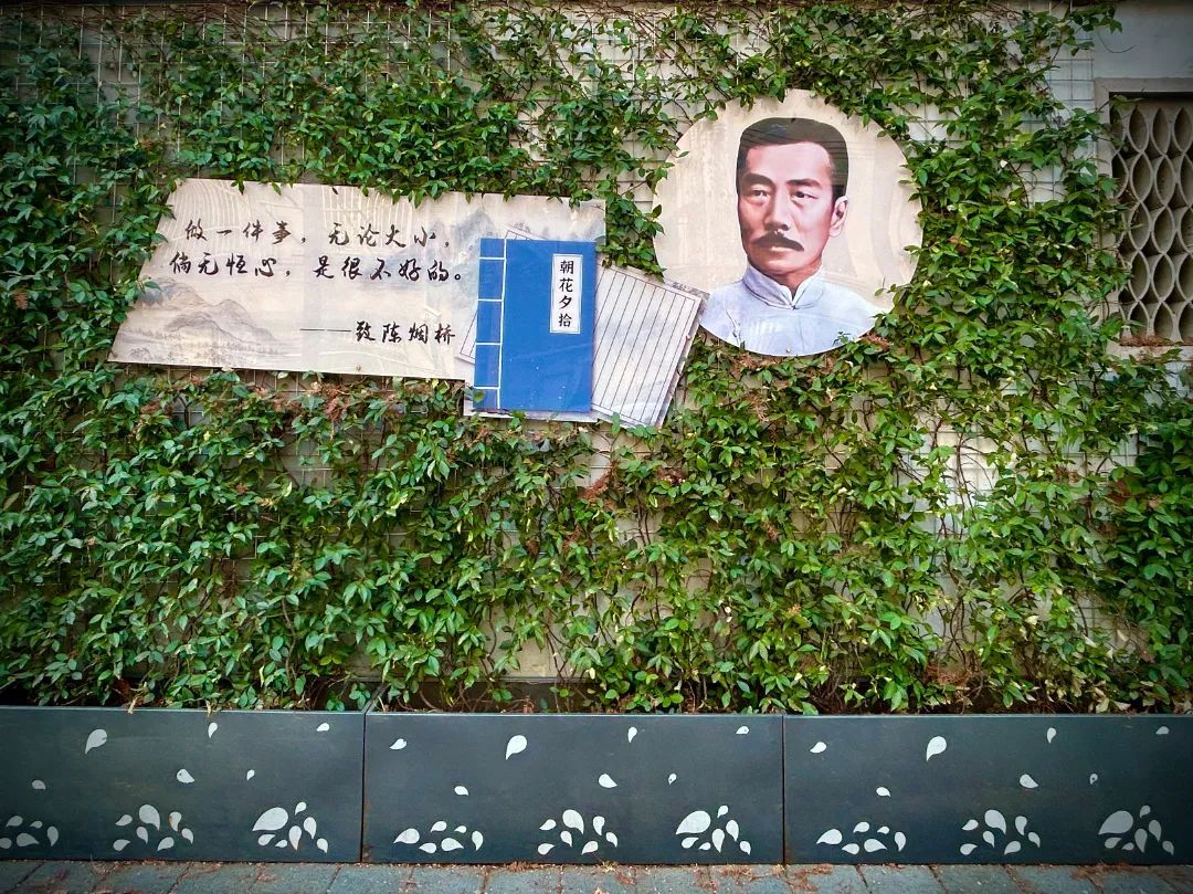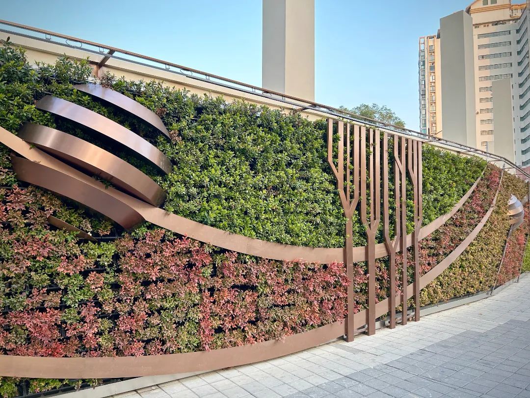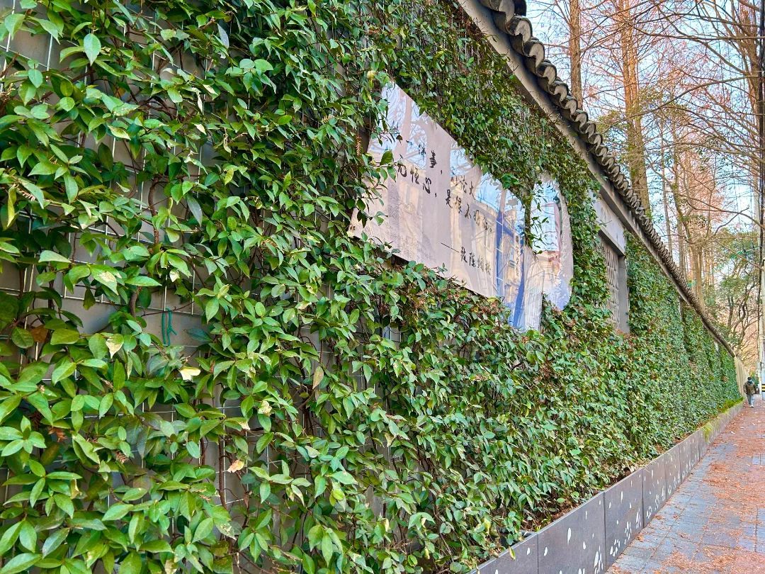甜爱路,被誉为“上海最浪漫的道路”。沿街围墙上的垂直绿化始建于2015年,原为结构式垂直绿化。为打造更为自然灵动的景观效果,该项目于2021年升级为“箱体绿化+自然攀缘”的种植方式:以镀锌钢丝网片搭建框架,并搭配不锈钢花箱,意大利络石沿墙面攀缘而上,金叶石菖蒲则点缀在箱沿,绿植错落有致、摇曳生姿,与墙面上的鲁迅先生名言相映成趣,于葱茏绿意中氤氲出浓郁的文化气息。
