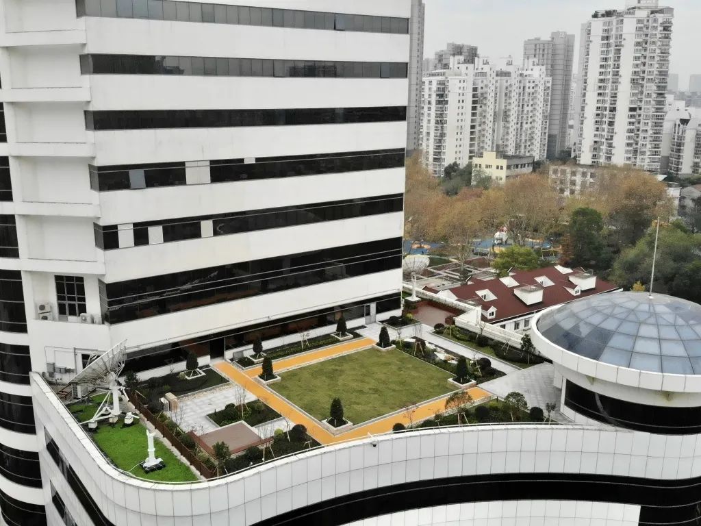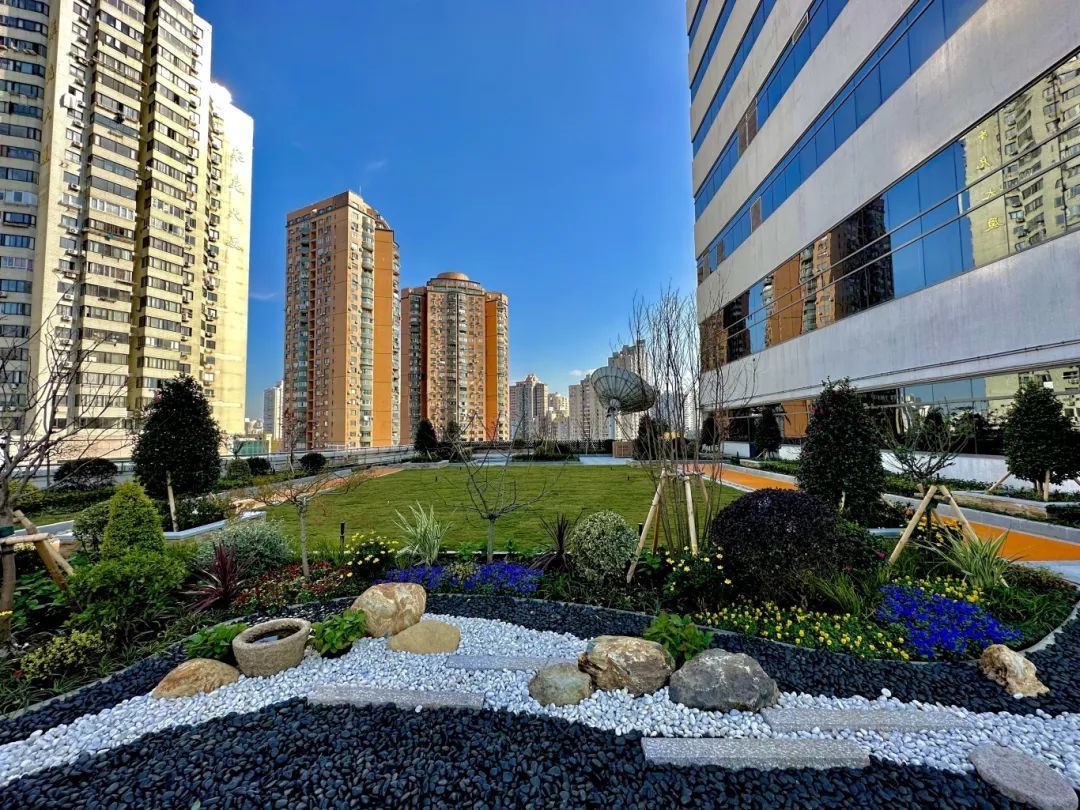 ▲上海教育电视台的屋顶绿化,精心布设了花境、草坪、步道等元素,构建出高低错落、色彩丰富、四季有景的景观效果。