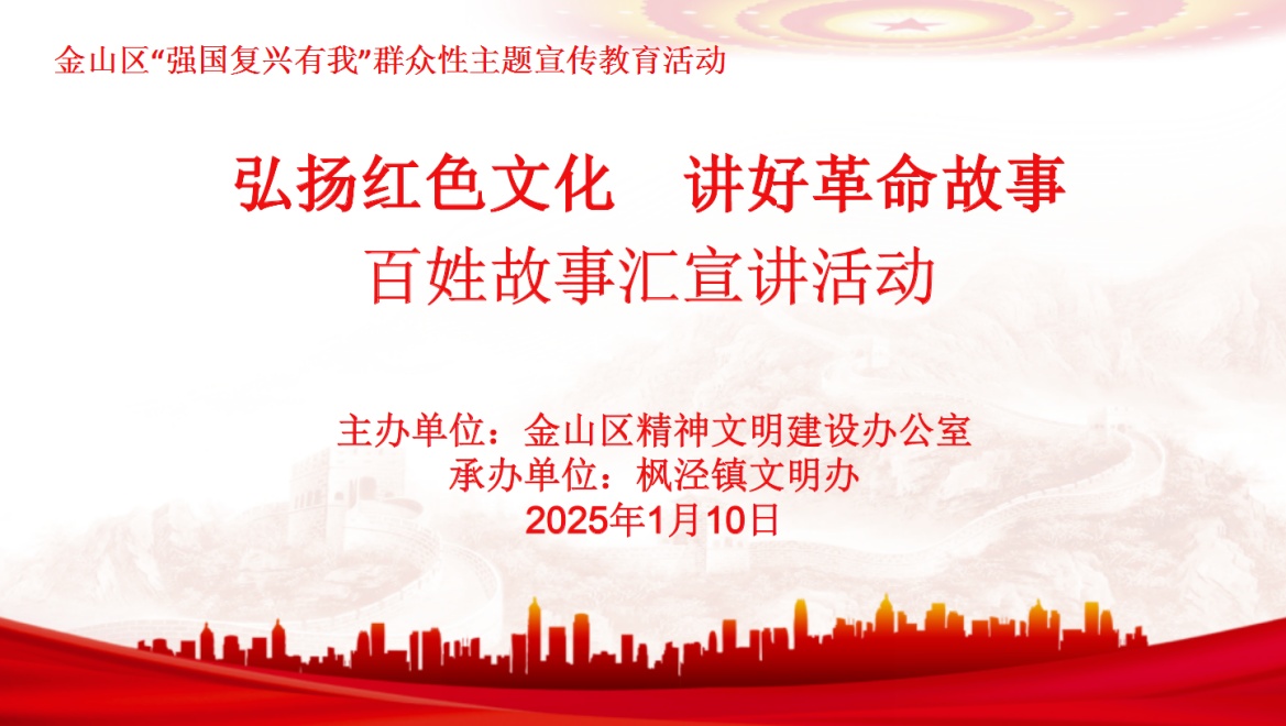金山区紧紧围绕“强国复兴有我”宣传教育主题,广泛开展群众性宣传教育活动。1月10日,由金山区精神文明建设办公室主办、枫泾镇文明办承办的“弘扬红色文化 讲好革命故事”百姓故事汇宣讲活动在枫泾镇枫阳居民区新时代文明实践站举行。