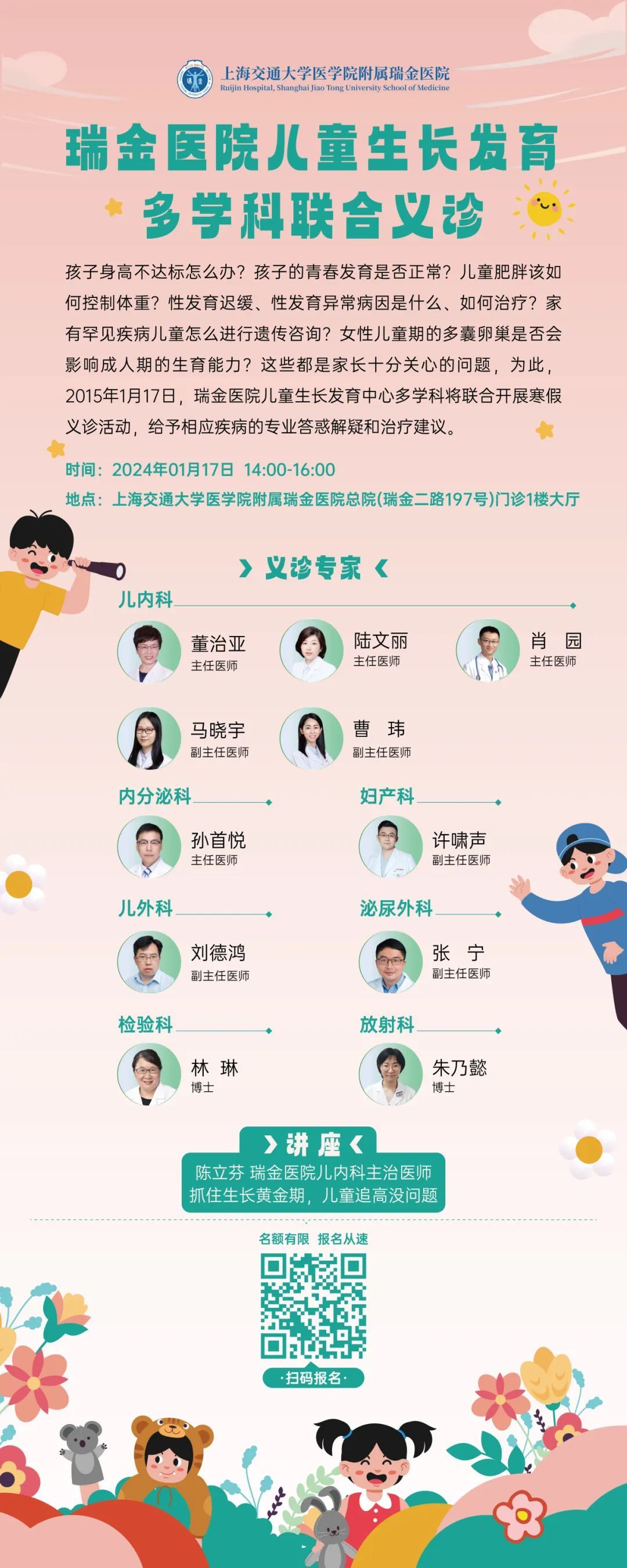 这些都是每位家长关心的问题。为了给家长们提供专业的解答,瑞金医院儿童生长发育中心将于2025年1月17日(周五)举办多学科联合义诊,此次活动邀请了儿内科、内分泌科、妇科、泌尿外科、儿外科、检验科和放射科的专家团队,为您提供全面、专业的咨询和建议。