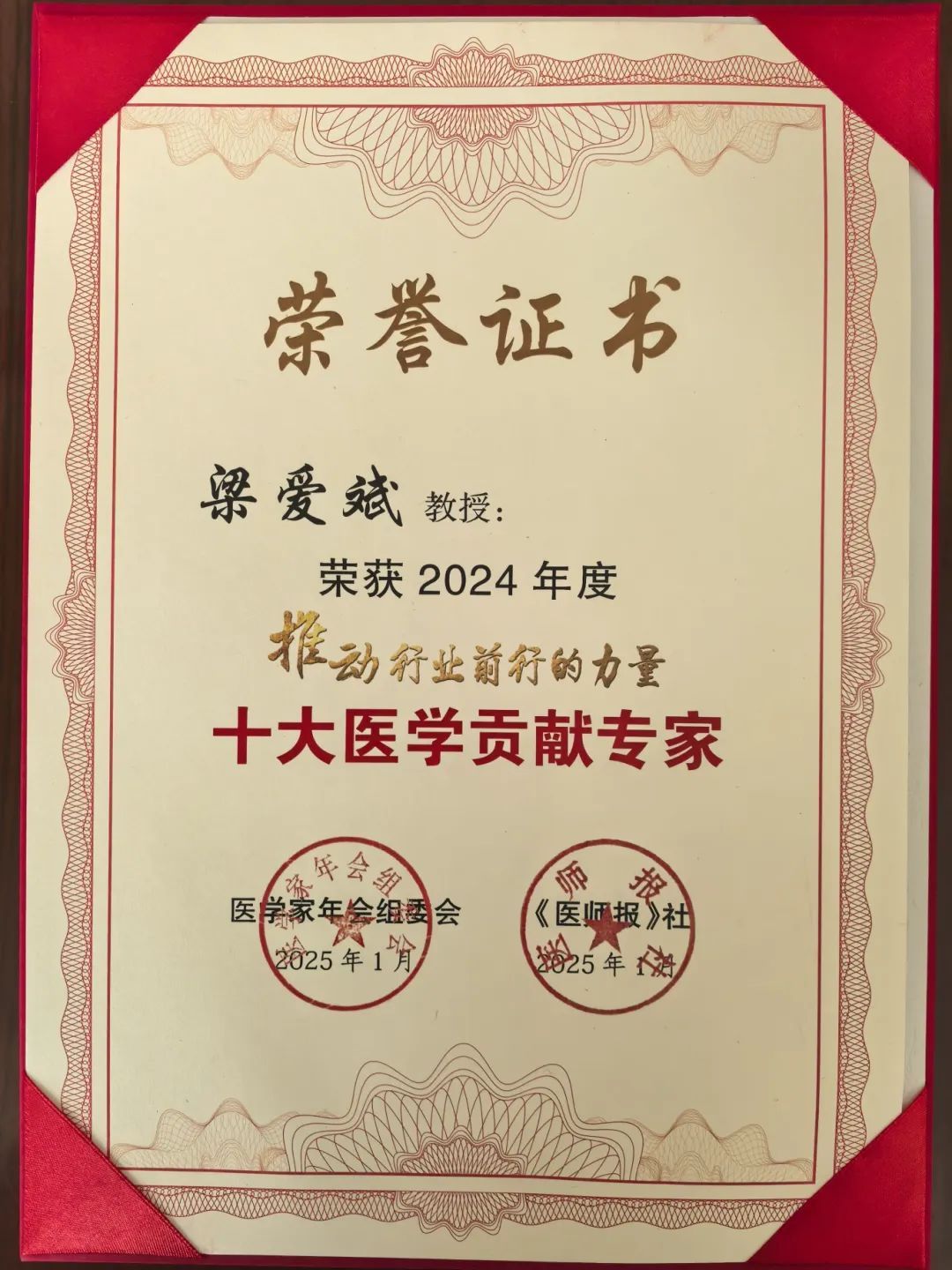1月9日,由《医师报》社主办,中国医药卫生事业发展基金会、中国医药卫生文化协会支持,医师网、医TV、《中国医院院长》杂志社、《中国社区医师》杂志社协办的“第十届医学家年会(2025)”在北京召开。本次年会颁发了“见证医学发展 致敬医界丰碑”“推动行业前行的力量”系列荣誉。同济大学附属同济医院梁爱斌教授荣获“2024年度十大医学贡献专家”奖项。
