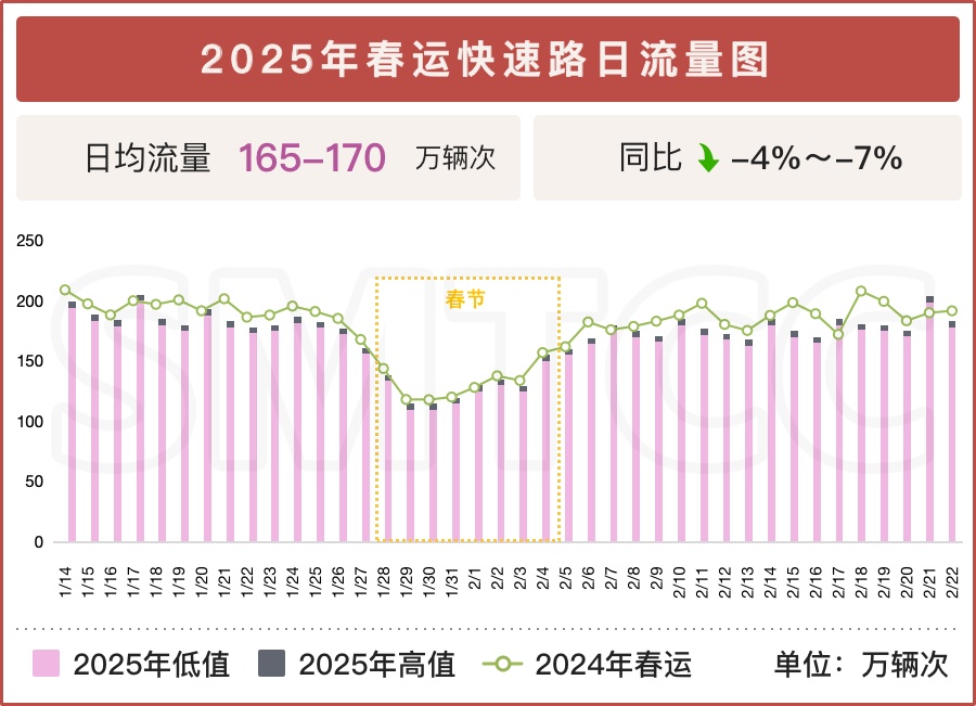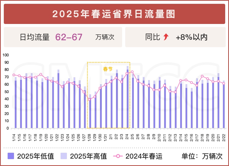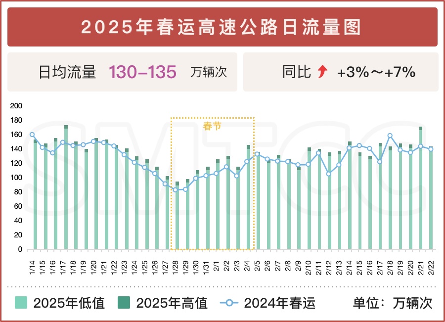 预计2025年春运期间高速公路日均流量130—135万辆次。春运前期高速公路车流规模居各阶段首位,春节期间高速公路车流规模处于低位,是春运乃至全年的最低水平;节后路网车流规模持续回升,正月十五之后高速公路流量基本恢复到常态水平。