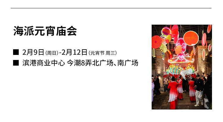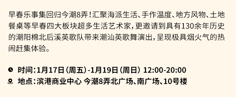市集将举办至1月12日,小虹了解到,一直到元宵佳节,这里还将举办一系列市集活动,从中式潮流、亲子共创、国潮非遗等不同主题,烘托海派春节热闹烟火气。例如,今年的早春乐事集就邀请到潮阳棉北后溪英歌舞队,将广东国家级非遗带至上海的广东弄堂,为上海市民游客带来别样春节年俗体验。