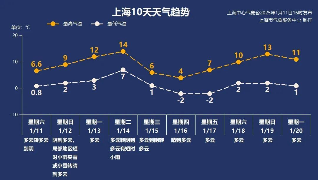 上海从明天开始至14日,气温完成三级跳,14日全天气温在7~14℃之间。15日受到冷空气影响,气温直线下跌,在1~6℃之间。16和17日市区最低气温零下2℃,将创入冬以来气温新低,郊区更低,届时全城冰冻,寒冷升级。18日起,白天气温回升,最高气温升至两位数,但早晚气温依然非常低,昼夜温差超10℃。