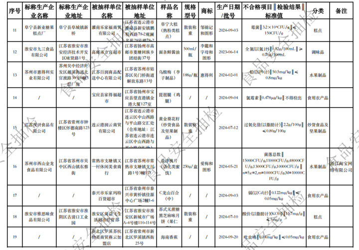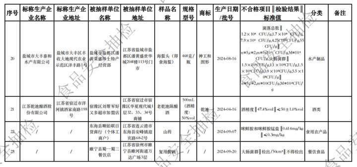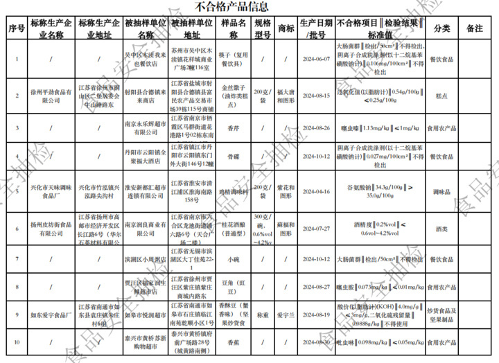 交汇点讯 近期,江苏省市场监督管理局组织食品安全抽检,抽取食用农产品、粮食加工品、糕点、食用油、油脂及其制品、炒货食品及坚果制品、调味品、酒类、饮料、茶叶及相关制品、水果制品、肉制品、保健食品、豆制品、蔬菜制品、餐饮食品、方便食品、乳制品、水产制品、糖果制品、速冻食品、罐头、饼干、淀粉及淀粉制品、蛋制品、薯类和膨化食品、食糖、冷冻饮品、蜂产品、可可及焙烤咖啡产品和食品添加剂等30大类食品2439批次样品,检出其中食用农产品、糕点、餐饮食品、调味品、水产制品、炒货食品及坚果制品、水果制品和酒类等8大类食品23批次样品不合格。