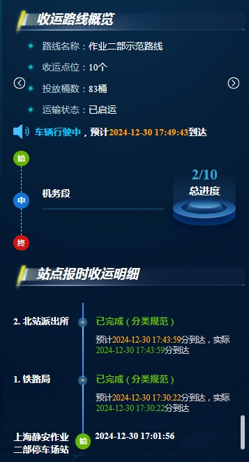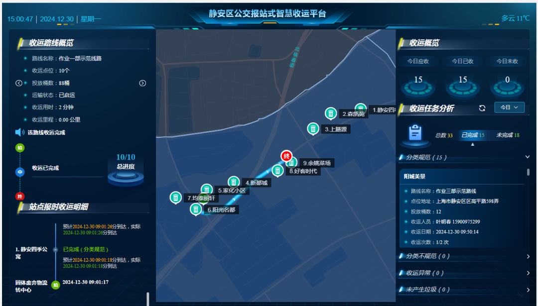 以“生活垃圾清运公交站牌式精准报时”示范线路为代表的静安智慧收运体系利用大数据分析现有数据和记录存储,通过历史数据预测特定区域垃圾产生量的变化趋势、停留时间等,及时优化点位清运情况,确保提升垃圾清运效能,为主管部门掌握第一手资料提供技术支撑。