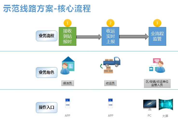 PC端系统围绕运营管理、业务配置、数据报表三大模块,实现环卫区域、点位、收运计划、收运路线以及环卫人员的基础数据设定。