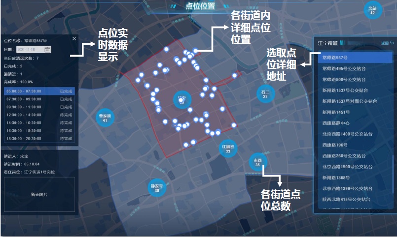 废物箱点位位置显示各街道废物箱总数量,同时选取相应点位可显示点位详细地址、点位计划完成清运次数、目前完成率、清运人员信息等。