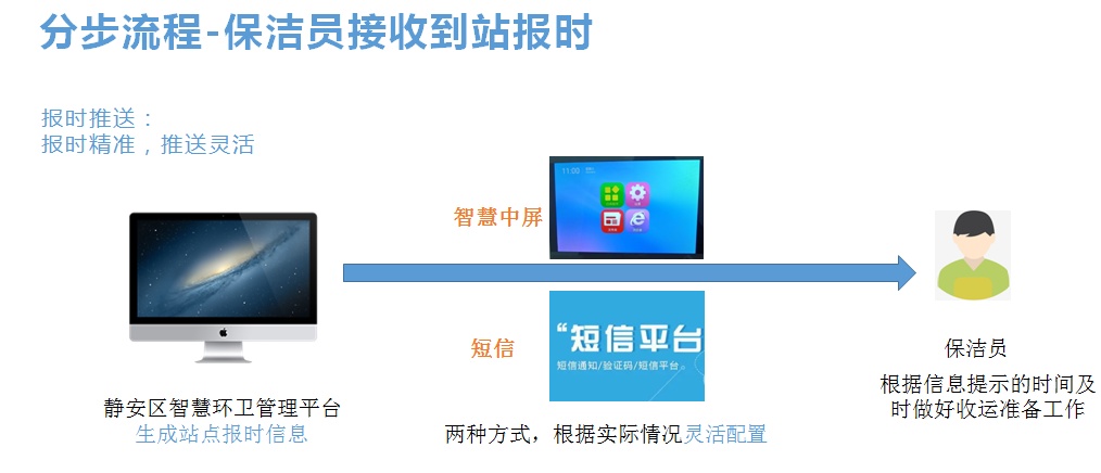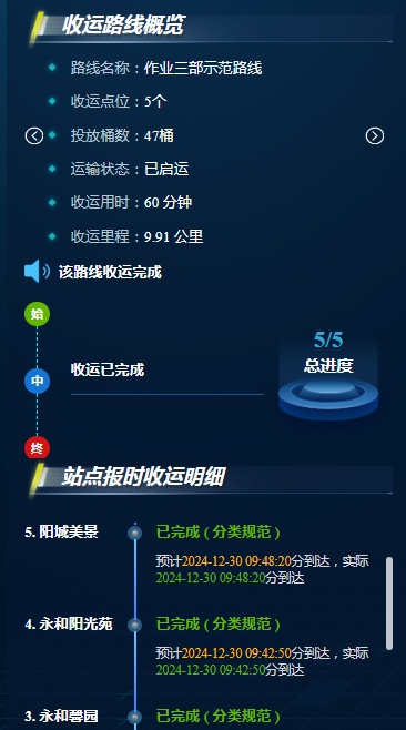 当清运车辆到达清运点位时,工作人员进行垃圾清运,实时上传当次收运量,并可及时上报收运过程中的异常情况,上报情况将同步到“垃圾清运精准报时”电子显示屏,便于属地街镇和保洁管理人员及时了解收运情况。点位清运完成后,将实时触发对下一个点位的报时推送,确保各点位之间信息畅通、无缝衔接。