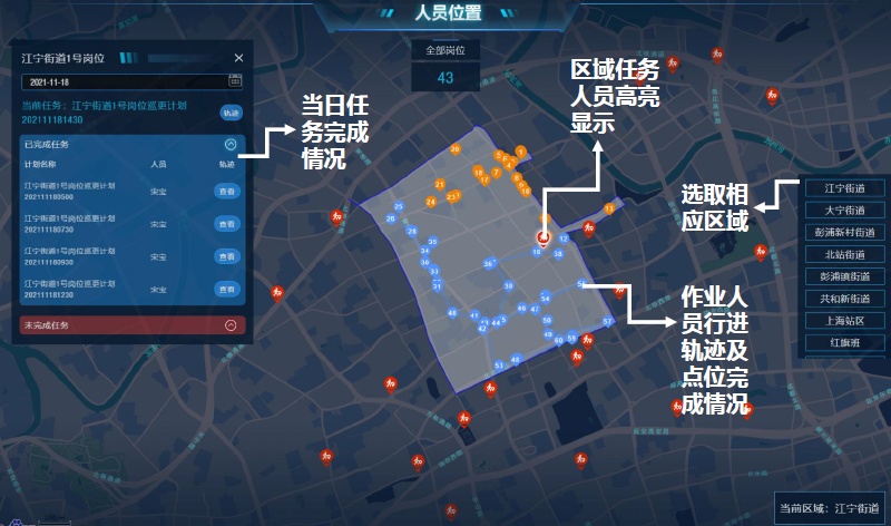 清运人员位置可显示所有废物箱清运人员位置,同时选取相应人员,会显示当日任务完成情况以及任务中的行进轨迹,点位完成度等。