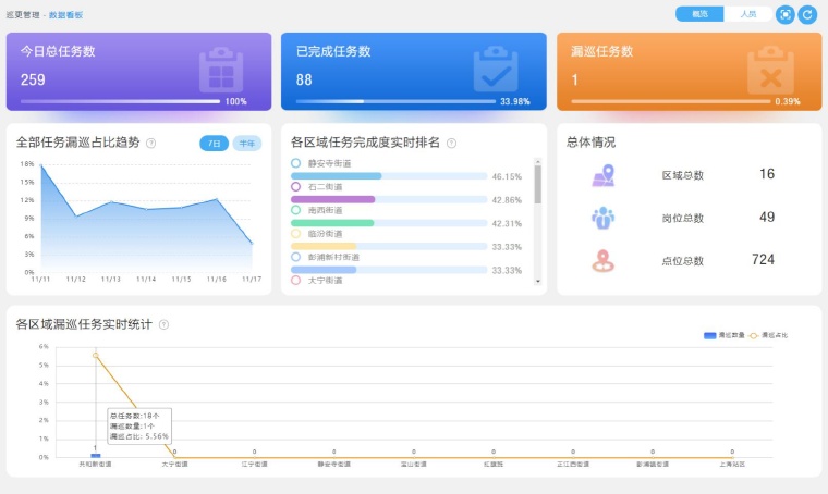 数据看板直观显示今日任务数量(已完成、漏巡)、漏巡任务实时统计以及每日占比趋势、各区域完成度排名等数据可视化展示。