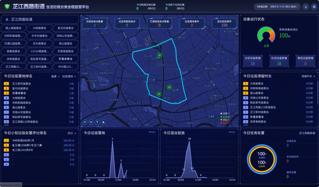 全区各街镇均建立生活垃圾分类一网统管平台,通过手机App、微信小程序等,实时监控小区垃圾分类投放点,把社区工作记录、垃圾清运台账、智能箱房数据、社区巡查反馈等信息融于一体,有效提升管理实效。通过安装监控设备,对投放点小包垃圾、投放点环境、居民乱投放行为等问题进行重点监管,也为城管执法部门开展个案针对性处罚取证夯实了基础,推进垃圾分类投放监管从“人防”向“技防”转变。