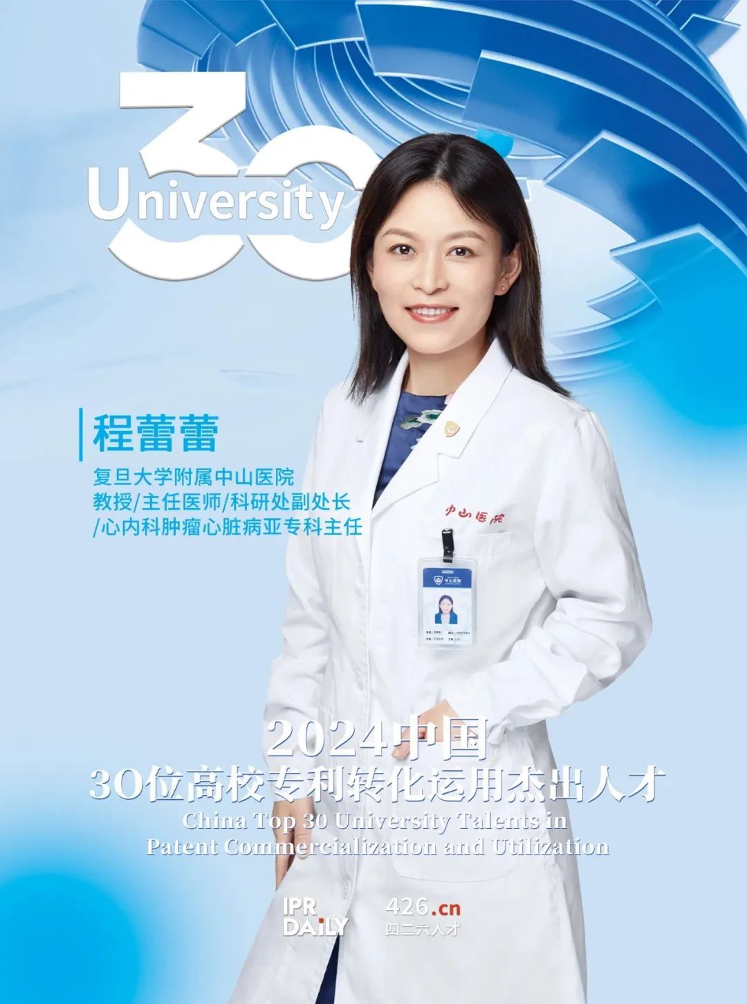 1月10日,2024年“中国30位高校专利转化运用杰出人才”榜单揭晓,我院科研处副处长、心内科肿瘤心脏病亚专科主任程蕾蕾教授荣获“中国30位高校专利转化运用杰出人才”称号。