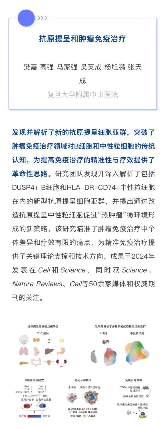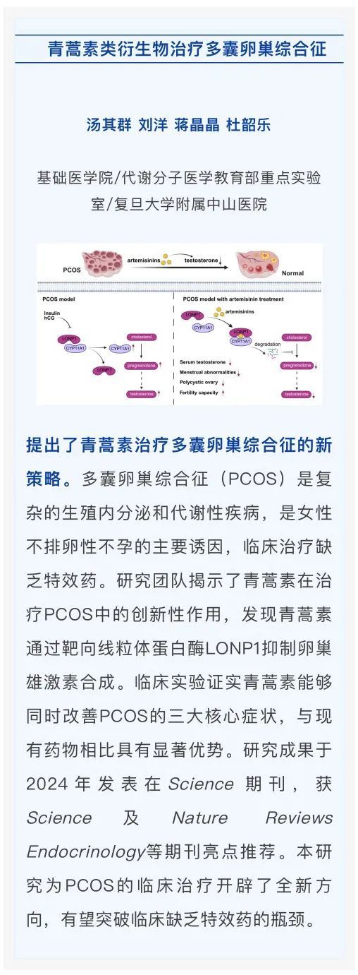 1月7日,复旦大学2024年度科技工作会议揭晓了2024年度复旦大学“十大科技进展”获奖名单。我院“抗原提呈和肿瘤免疫治疗”成果获得2024年度复旦大学“十大科技进展”。我院参与的“青蒿素类衍生物治疗多囊卵巢综合征”成果入选2024年度复旦大学“十大科技进展”提名名单。