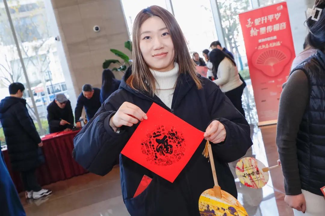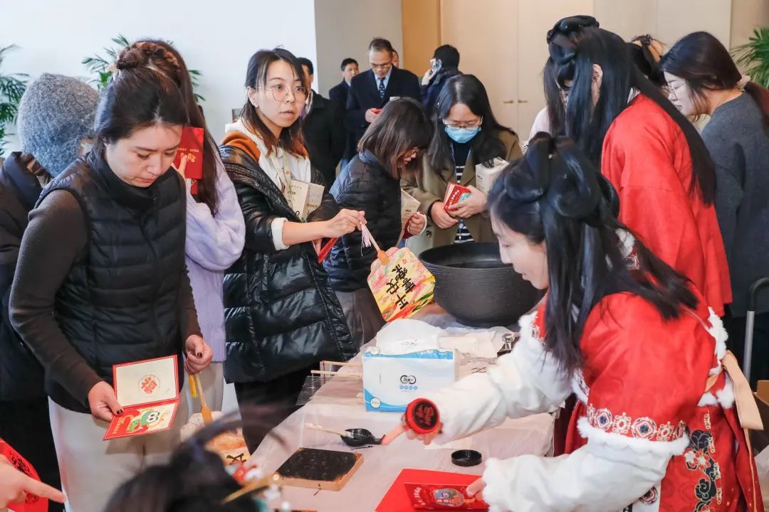 此外,淮海中路街道还在现场设置了“我们的节日•春节”迎春文明集市,摆放了各类非遗互动摊位——宋式点茶表演、拓印、漆扇、投壶、击鼓传花,在营造新春欢乐氛围的同时,也让白领们沉浸式感受到了春节的历史文化意蕴。该活动亦是“淮海家里幸福年”“巳巳如意•五福临门”集章系列活动的一环,参与者可通过集齐“五福”获取新年好礼,从而让楼宇白领们在“淮海家”有更多幸福感、获得感。