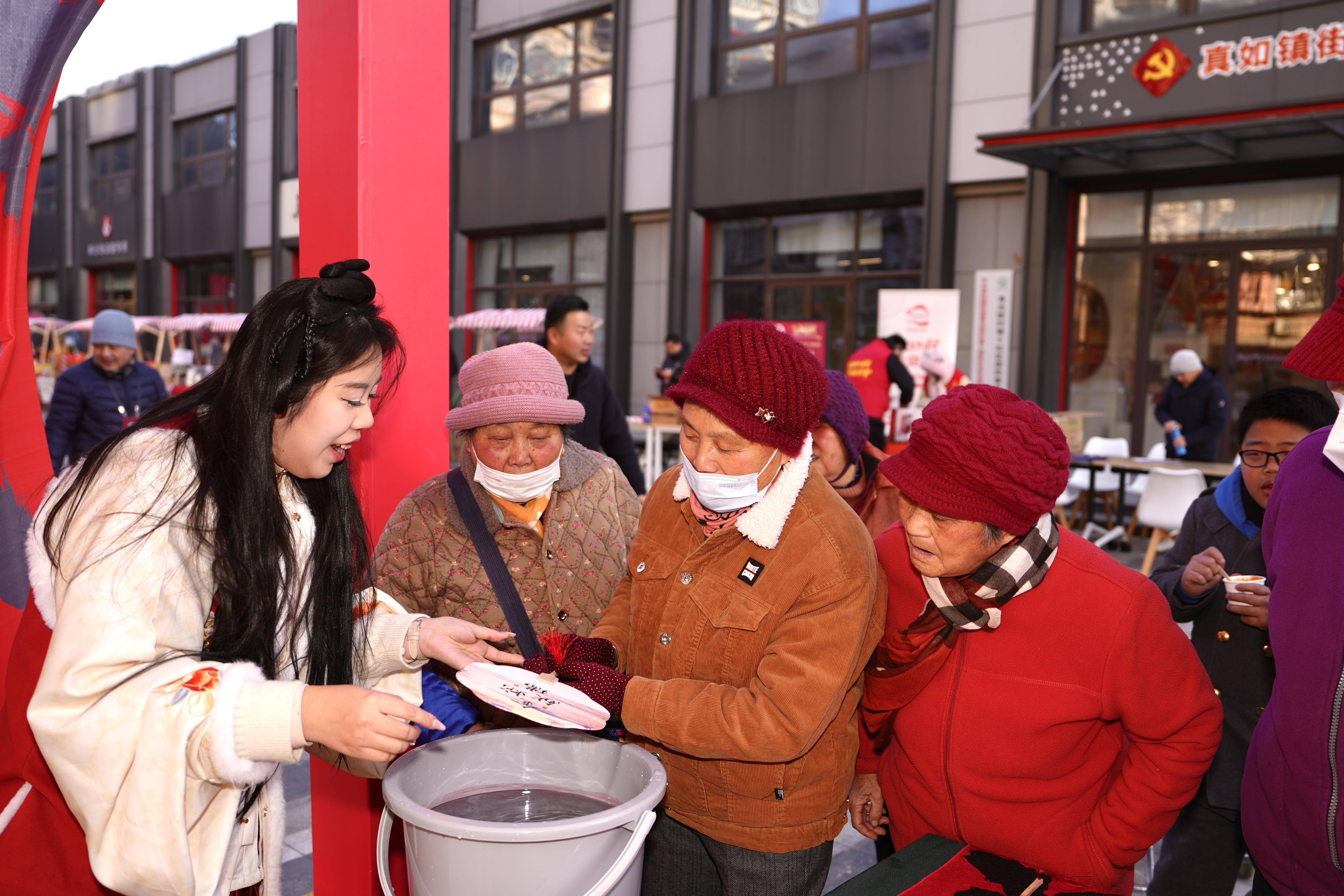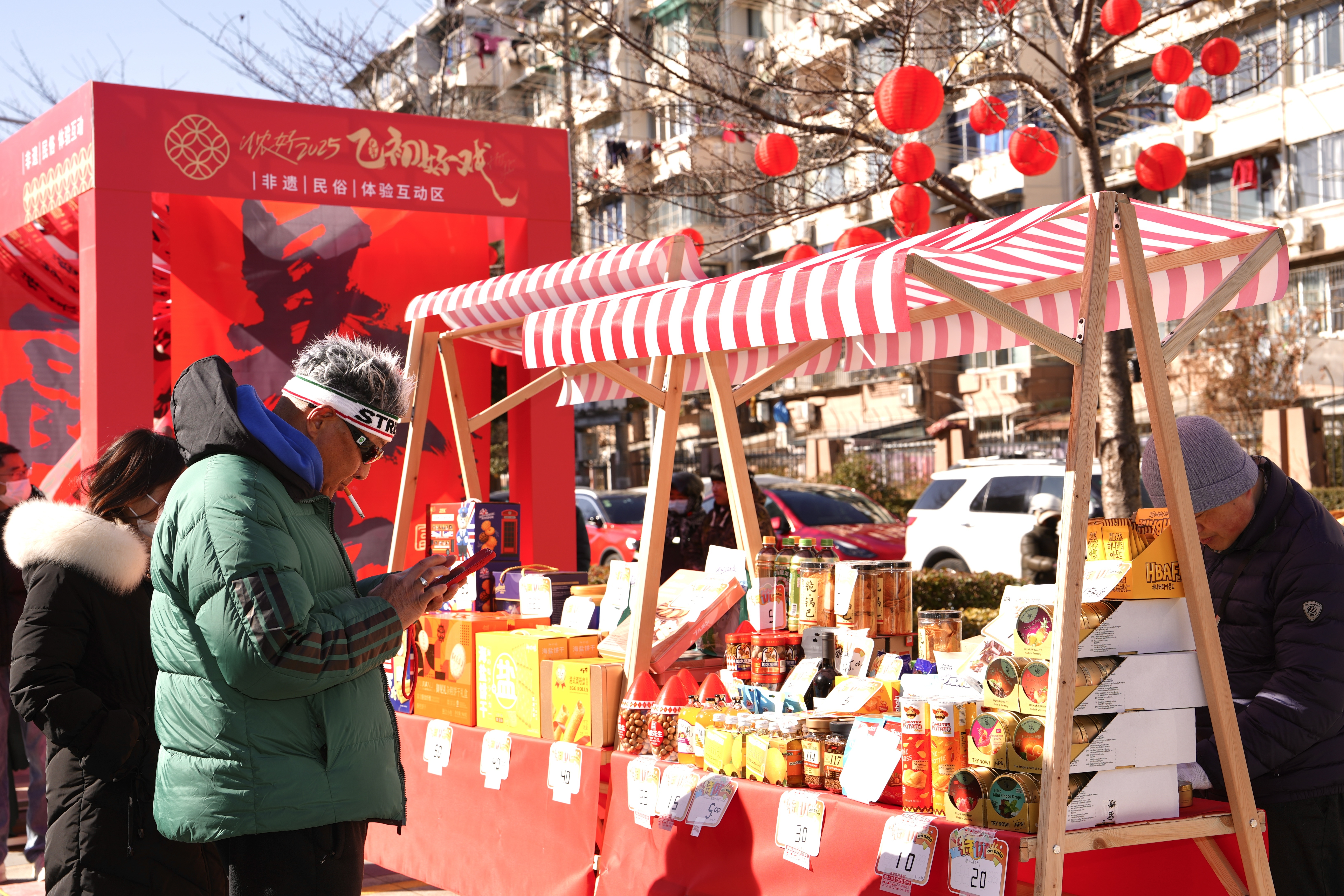 过了腊八就是年。近日,申城大街小巷开始张灯结彩,营造出“红红火火过大年”的新春气象。在普陀区真如镇街道真光党群服务中心户外广场上,“乙初好戏”2025年“真无忧”系列迎新活动举行首发仪式,吸引了不少周边居民驻足围观。市集里不仅有浓浓年味儿,更有趣味非遗体验和实惠年货。