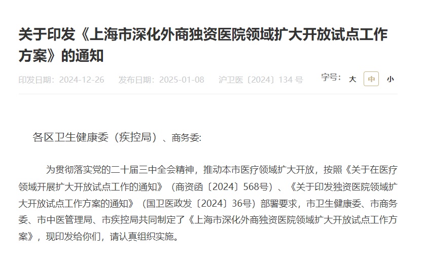 去年11月,国家卫生健康委等四部门印发方案,明确允许在北京、天津、上海、南京、苏州、福州、广州、深圳和海南全岛设立外商独资医院。 近日,上海市相关工作方案出炉!市卫生健康委、市商务委、市中医管理局、市疾控局共同制定了《上海市深化外商独资医院领域扩大开放试点工作方案》(以下简称《方案》)允许在上海市设立外商独资医院(中医类除外,不含并购公立医院)。 鼓励在自贸试验区、临港新片区、虹桥商务区、东方枢纽国际商务区等扩大开放试点区域、生物医药产业集聚区域和外籍人士集中居住的中心城区设立外商独资医院。 上海市人民政府网站截图: 符合规定的可纳入医保定点 中方管理人员不得少于一半 《方案》说,原则上,单个特殊功能区和外籍人士集聚区内设置不超过2家,能够提供国际先进的医院管理理念、管理模式和服务模式;能够提供具有国际领先水平的医学技术和设备。此外,可以补充或改善当地在医疗服务能力、医疗技术和医疗设施方面的不足,拓展多元化服务供给格局。 医院的诊疗科目不得登记血液内科; 医院不得开展医疗和伦理风险较高的诊疗活动,主要包括人体器官移植技术、人类辅助生殖技术、产前筛查和产前诊断技术,精神科住院治疗,肿瘤细胞治疗新技术试验性治疗等。 符合医保有关规定的医院可按程序申请纳入医保定点,同时鼓励医院对接国内外商业健康保险。 此外,允许医院按规定聘用外国医师、港澳台医师、港澳其他卫生专业技术人员短期执业,全院管理和卫生专业技术人员的中方(内地)人员占比均不得少于50%。 上海市深化外商独资医院领域扩大开放试点工作方案全文如下 ↓↓↓ 上下滑动查看更多 上下滑动阅读更多内容 上海市深化外商独资医院领域扩大开放试点工作方案 为进一步丰富本市医疗服务供给,优化营商环境,满足多层次、多元化健康服务需求,根据国家卫生健康委、商务部、国家中医药局、国家疾控局制定的《独资医院领域扩大开放试点工作方案》,制定本方案。 一、试点范围 允许在上海市设立外商独资医院(中医类除外,不含并购公立医院)。鼓励在自贸试验区、临港新片区、虹桥商务区、东方枢纽国际商务区等扩大开放试点区域、生物医药产业集聚区域和外籍人士集中居住的中心城区设立外商独资医院。 二、试点数量 原则上,单个特殊功能区和外籍人士集聚区内设置不超过2家。 三、试点条件 (一)投资主体条件。申请设立外商独资医院的境外投资者应当是能够独立承担民事责任的法人,具有直接或间接从事医疗卫生投资与管理的经验,并符合以下条件: 1.能够提供国际先进的医院管理理念、管理模式和服务模式; 2.能够提供具有国际领先水平的医学技术和设备; 3.可以补充或改善当地在医疗服务能力、医疗技术和医疗设施方面的不足,拓展多元化服务供给格局。 (二)设立和运行条件。外商独资医院应当按照有关法律法规规定设立和运行,并符合以下条件: 1.医院的经营性质可以是营利性或者非营利性; 2.医院类别为综合医院、专科医院、康复医院,医院级别为三级,不得设立精神病医院、传染病医院、血液病医院、中医医院、中西医结合医院、少数民族医医院; 3.医院的诊疗科目不得登记血液内科; 4.医院不得开展医疗和伦理风险较高的诊疗活动,主要包括:人体器官移植技术、人类辅助生殖技术、产前筛查和产前诊断技术,精神科住院治疗,肿瘤细胞治疗新技术试验性治疗等; 5.允许医院按规定聘用外国医师、港澳台医师、港澳其他卫生专业技术人员短期执业,全院管理和卫生专业技术人员的中方(内地)人员占比均不得少于50%; 6.医院信息管理系统应当接入市、区医疗服务监管平台,电子病历、医用设备等信息存储服务器应当位于我国境内; 7.符合医保有关规定的医院可按程序申请纳入医保定点。同时,鼓励医院对接国内外商业健康保险。 四、管理措施 根据《医疗机构管理条例实施细则》《上海市医疗机构管理办法》等规定,市、区卫生健康部门依法履行对外商独资医院的准入和事中事后管理职责。外商独资医院应当依法开展诊疗活动,并加强自我管理。 (一)准入管理 1.审批部门。外商独资医院应当符合区域卫生规划,有关设置审批、执业登记等参照《中外合资合作医疗机构管理暂行办法》《卫生部关于调整中外合资合作医疗机构审批权限的通知》执行。外商独资医院由区卫生健康委初审,符合条件的,由市卫生健康委核发《设置医疗机构批准书》和《医疗机构执业许可证》;已执业、符合条件的医疗机构所有制形式变更为外商独资的,办理执业变更手续。 2.现场审查。市、区卫生健康委受理外商独资医疗机构设置和执业申请后,市、区卫生健康委应当开展现场审查,重点对选址布局、功能定位、办医资质等进行审查,指导医疗机构按照国家有关标准做好设计、施工和验收,验收不合格的建筑不得投入使用。 3.社会公示。区卫生健康委对拟设置外商独资医疗机构进行为期5个工作日的公示,并形成书面意见。公示内容包括医疗机构的类别、选址、诊疗科目、床位(牙椅)、设置人情况等。公示期间接到实名举报或异议的,区卫生健康委应当及时组织查实,未通过公示的,市卫生健康委不予核发设置医疗机构批准书。 4.审批时限。对申请设置的外商独资医院,区卫生健