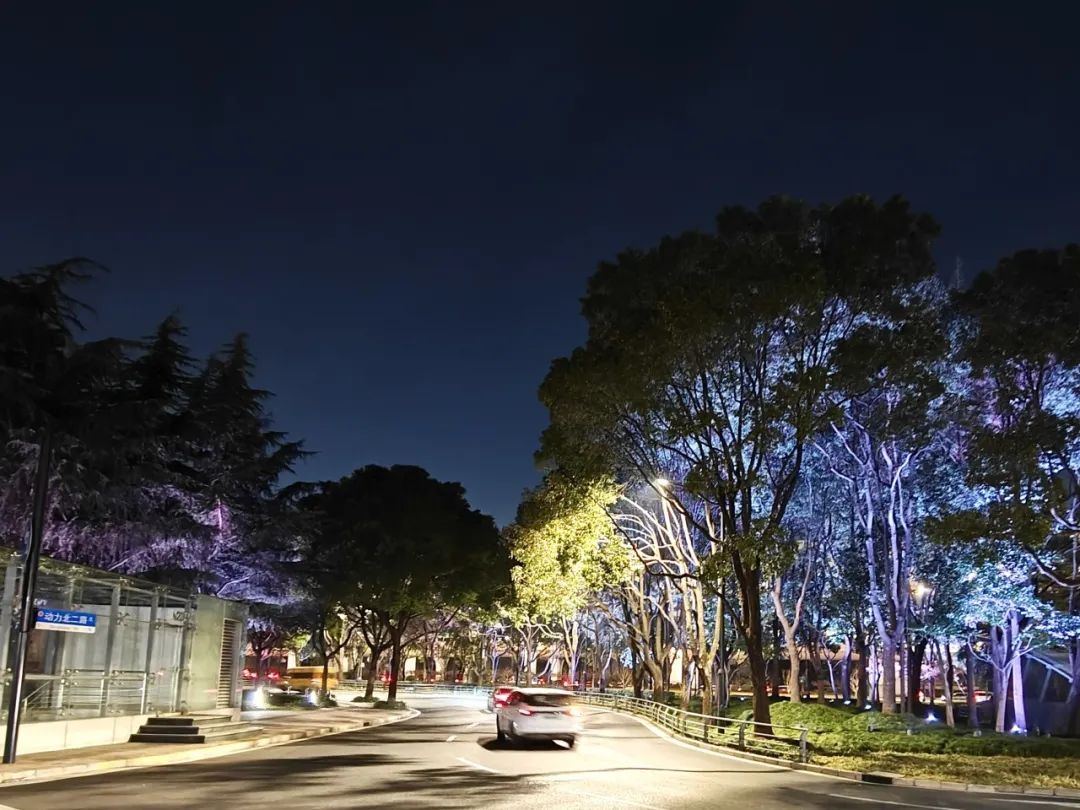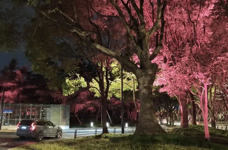 北广场,草坪灯与投光灯彼此呼应,投光灯以其变幻莫测的色彩节奏,将树丛编织成一幅幅流动的光影画卷,绚烂多彩,生机勃勃,为夜晚的南站披上了一袭梦幻的霓裳。