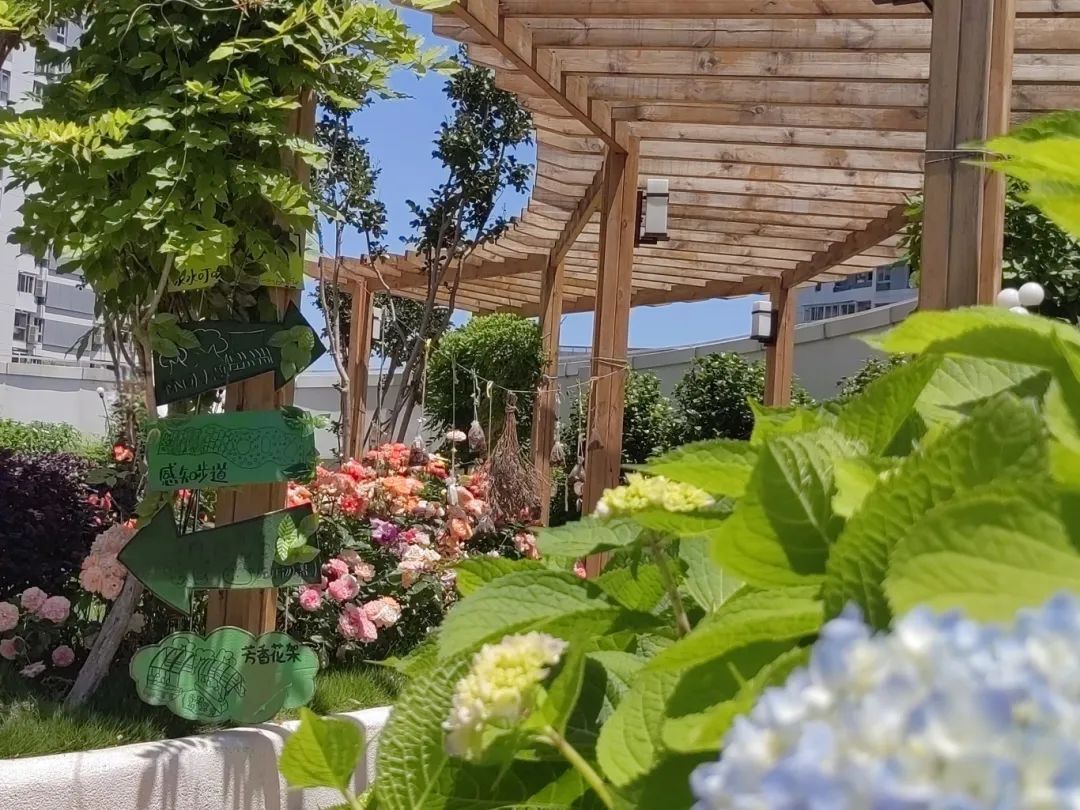 滨江园三楼的云顶露台园原本是一片平坦的塑胶地,配备了多种类的建构积木,孩子们玩得乐此不疲。然而随着夏季来临,孩子们因为炎炎烈日发起了愁。大班的孩子们在“小红星议事会”开启了关于“露台改建”的议题讨论。“我希望这里有可以遮阳休息的长廊”“我喜欢彩色的小路”“我想要种好多香香的花”“我希望夏天可以玩水”“我想和小动物一起玩”……孩子们纷纷出谋划策,共同描绘出一个既美丽又充满梦幻色彩的屋顶花园。在友好小使者的建议下,一个汇聚阳光、流水、泥地、石块、木桩及各种植被的美丽花园诞生了!花园中的每个角落都吸引幼儿走进其中,享受自然、探索自然、畅玩自然。