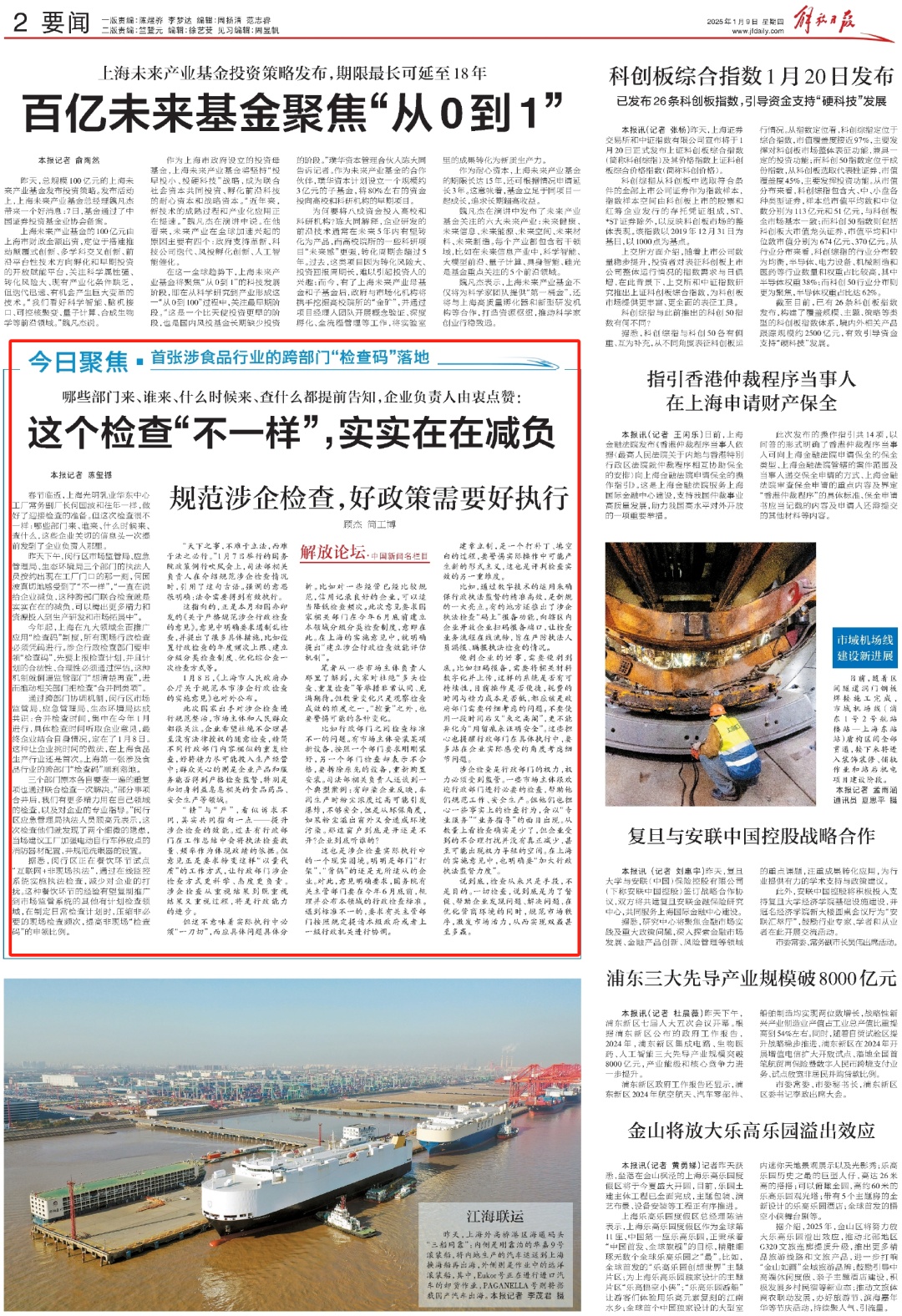 1月9日,解放日报2版要闻刊发《这个检查“不一样”,实实在在减负》,关注上海市首张涉食品行业的跨部门“检查码”在闵行落地,一起来看→ 良好的营商环境,既要能“有求必应”,也要能“无事不扰”,尽可能“进一扇门、查多件事”,让企业集中精力做好自己的运营。 春节临近,常务副厂长何国波和往年一样,做好了迎接频繁检查的准备,但这次检查据说很不一样,哪些部门来、谁来、什么时候来、查什么,这些企业关切的信息头一次提前发到了企业负责人那里。 1月8日下午,闵行区市场监管局、应急管理局、生态环境局三个部门的执法人员按约出现在上海光明乳业华东中心工厂门口的那一刻,何国波真切地感受到了“不一样”。 他发自内心地给上海营商环境点赞:“一直在说给企业减负,这种跨部门联合检查就是实实在在的减负,预计全年可减少三分之二的检查,腾出更多精力和资源投入到生产研发和市场拓展中。” 上海第一张涉及食品行业的跨部门“检查码”顺利落地 上海光明乳业华东中心工厂这类食品生产企业涉及城市保障和安全的方方面面,一直是相关监管部门重点关注的对象。 “各种检查,一年30多次是有的,对正常运营总有些影响。”何国波表示,许多专业的检查指导是有必要的,能及时发现解决问题,企业很欢迎,但一些临时性的综合检查必要性不大,比如其他城市、有关行业发生了问题或者逢年过节前,从国家部委、市区条线到街镇属地,都频繁来人检查,其实前几天刚查过。