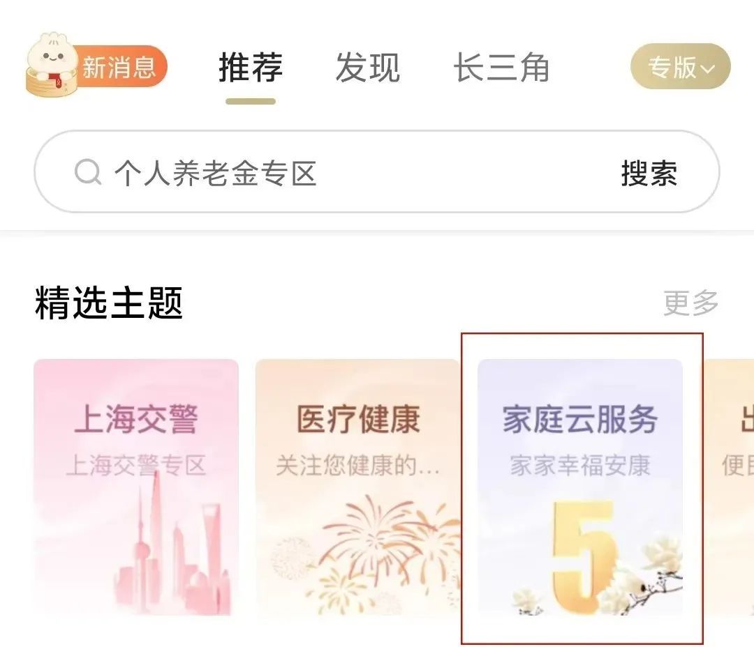 移动端:打开“随申办市民云”(APP、支付宝小程序、微信小程序),直接搜索“家庭专栏”或在“精选主题”找到“家庭云服务”。