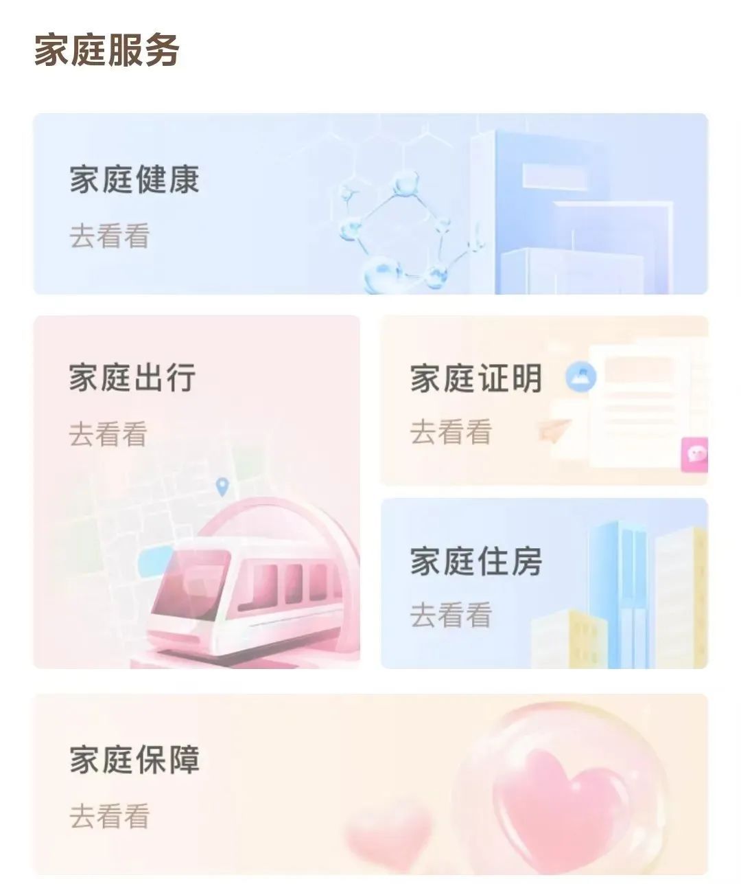 涵盖家庭健康、证明、保障、住房、出行五个生活类应用场景,全方位加强协同,充分利用“一网通办”平台实现社会福祉、基层治理、文化建设等各类资源共享与个性化精准供给,推动实现家庭发展、家庭服务、家庭教育、家庭文明、家庭参与基层治理再上新台阶。