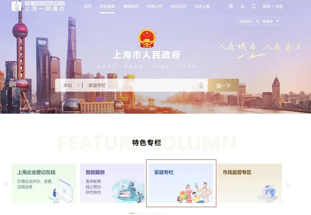电脑端:登录一网通办政务服务首页(https://zwdt.sh.gov.cn/),直接搜索或在特色专栏找到“家庭专栏”。