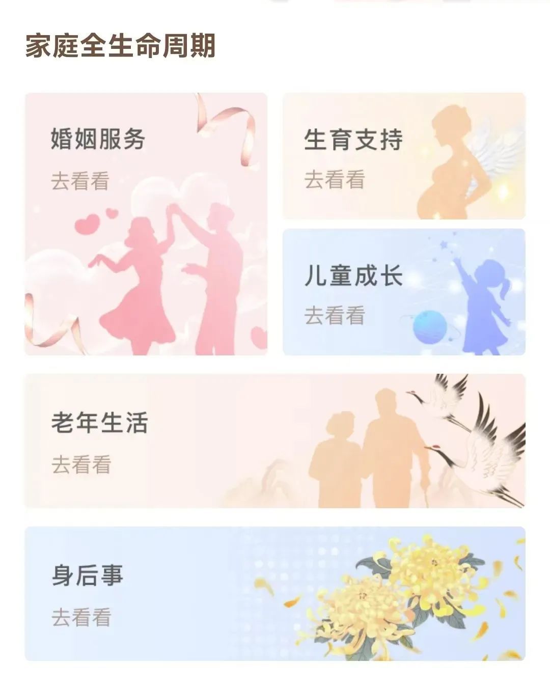 依据家庭发展规律整合婚姻服务、生育支持、儿童成长、老年生活、身后事五个阶段资源,将公民婚育一件事、出生一件事、适龄幼儿入园、义务教育入学报名、企业职工退休一件事等家庭热门服务事项归集至一个入口,让城市数字化转型为家庭构筑全生命周期服务体系,促进家庭和睦、幼有善育、学有优教、老有颐养,使千千万万个家庭成为国家发展、民族进步、社会和谐的重要基点。