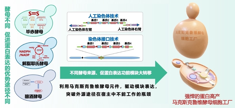通过合成生物学技术,吕红团队将马克斯克鲁维酵母打造为高效的细胞工厂。团队发明了人工染色体技术,实现了其他酵母菌高产蛋白途径的大规模转移。