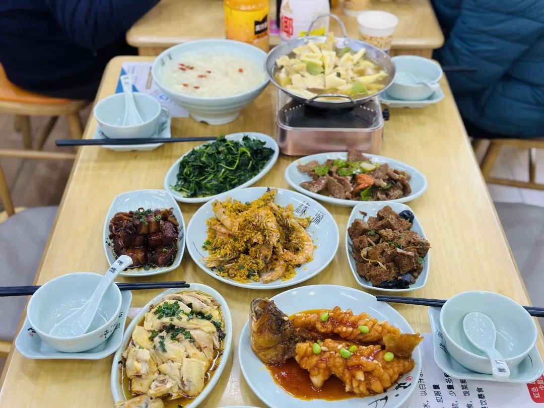 临近晚饭时间,报名参加年夜饭试吃的近三十位居民陆续走进华富社区食堂。看到热气腾腾的菜肴,大家脸上都洋溢着期待的笑容。工作人员热情地引导大家入座,为每位居民准备好餐具,并一一介绍桌上的菜品。松子鲈鱼色泽金黄,避风塘炒虾外皮略带焦黄,水笋烤肉浓油赤酱,蚝油牛肉鲜美浓郁,老上海腌笃鲜浓香扑鼻……每一道菜品都色泽鲜亮,散发着诱人的香气,不仅色香味俱佳,更充满了浓厚的年味。