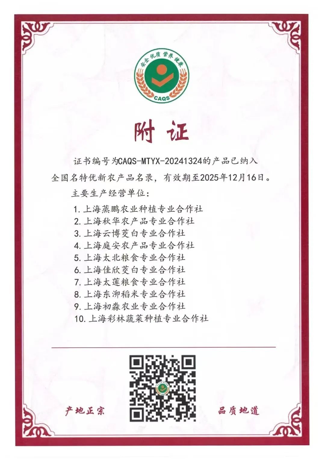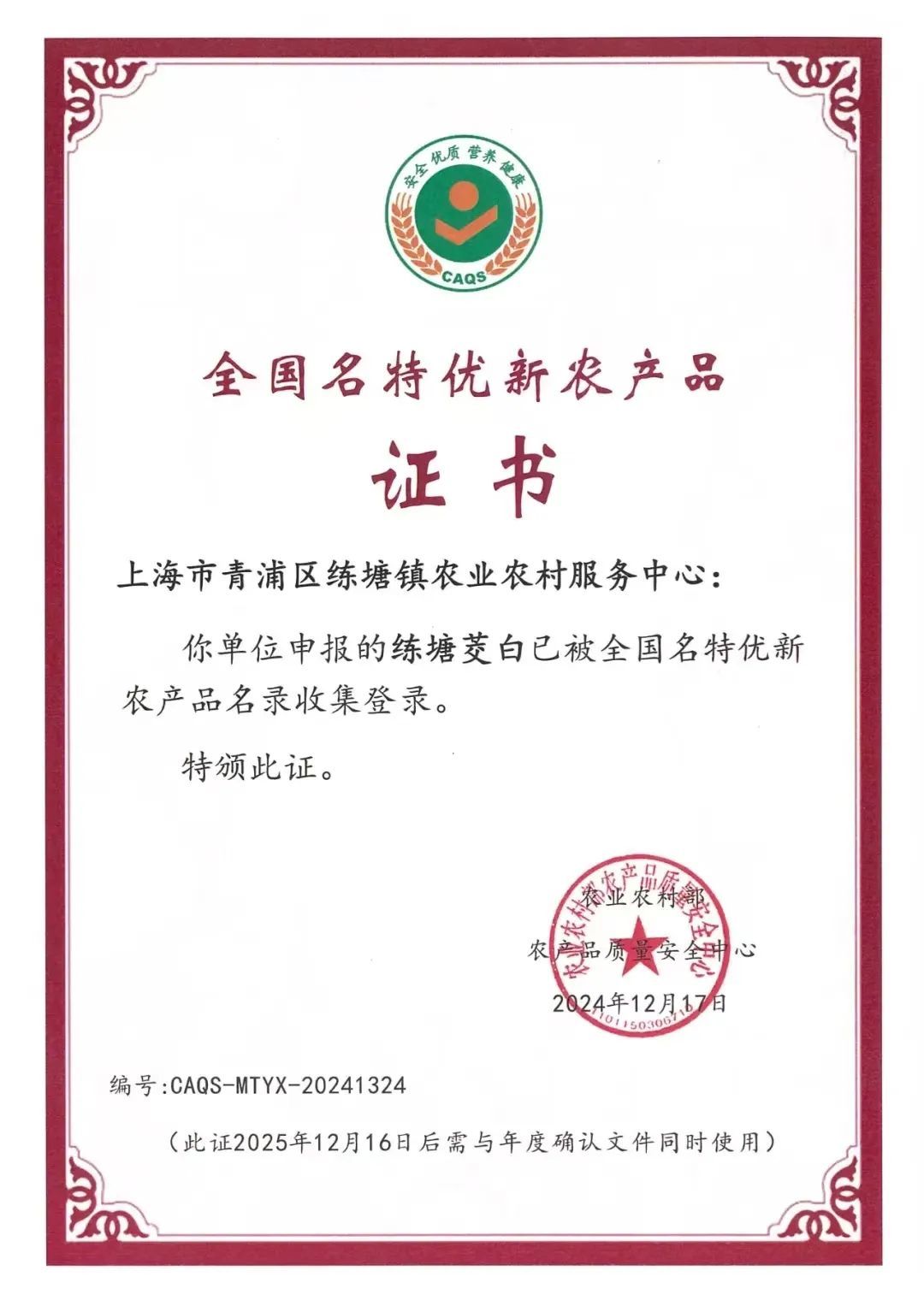 据介绍,全国名特优新农产品是指在特定区域内生产、具备一定生产规模和商品量、具有显著地域特征和独特营养品质特色、公众认知度和美誉度高的,经农业农村部认可的绿色有机优质农产品。全国名特优新农产品证书长期有效,并实行年度确认制度。截至目前,青浦区名特优新农产品已增至4个,分别是金泽大米、白鹤草莓、重固生菜和练塘茭白。