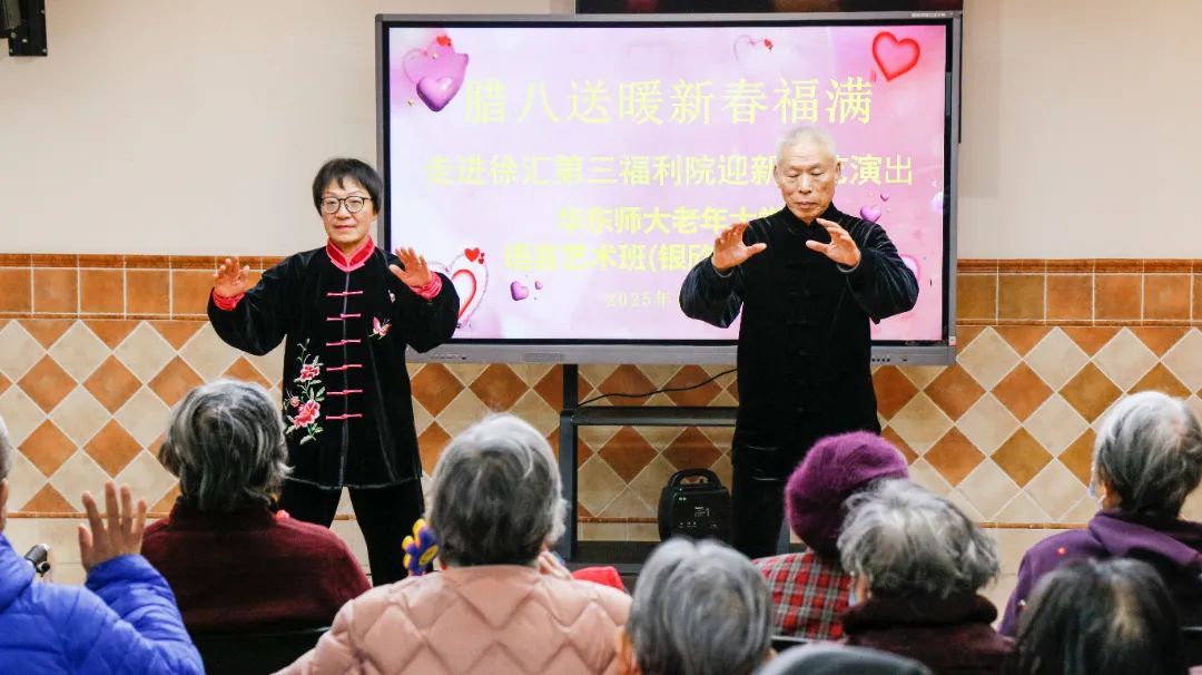 要让老年人的晚年生活过得幸福美满,不仅要解决老年人“衣食住行”的切实问题,更要关注老人们的精神文化需求。近日,上海市徐汇区第三老年福利院(以下简称“三福院”)中,上演了一场特别的文艺汇演,此次演出由华东师范大学老年大学(以下简称“华东师大老年大学”)志愿服务工作站精心策划,为老人们送上一份别样的节日问候,让这个冬天更加温馨。