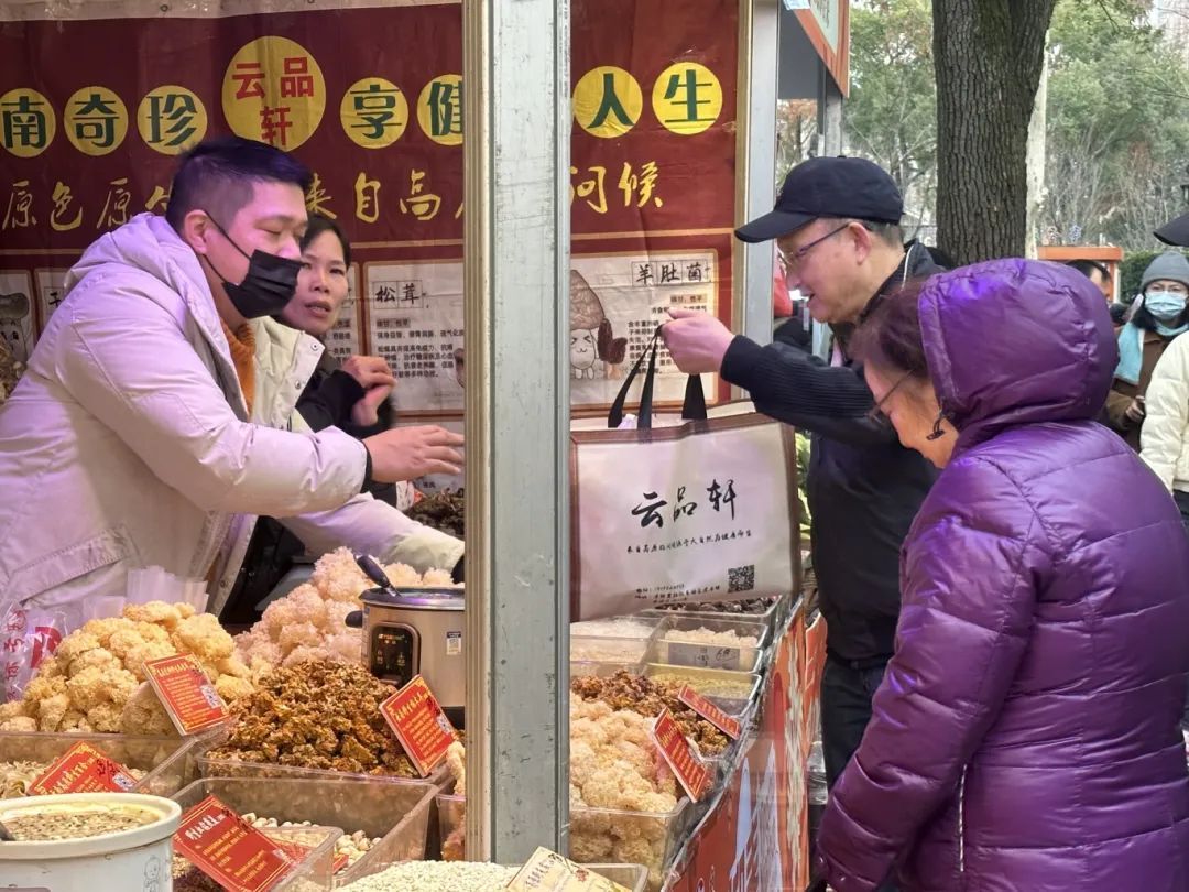 在云南菌品摊位前,摊主热情地介绍,“我们的银耳卖得非常好,因为冬天皮肤需要补水,银耳不仅能润肺,还能美容养颜。”一位市民介绍,白木耳要泡发后,加入桂圆红枣一起煮,就像煲甜羹一样美味。”