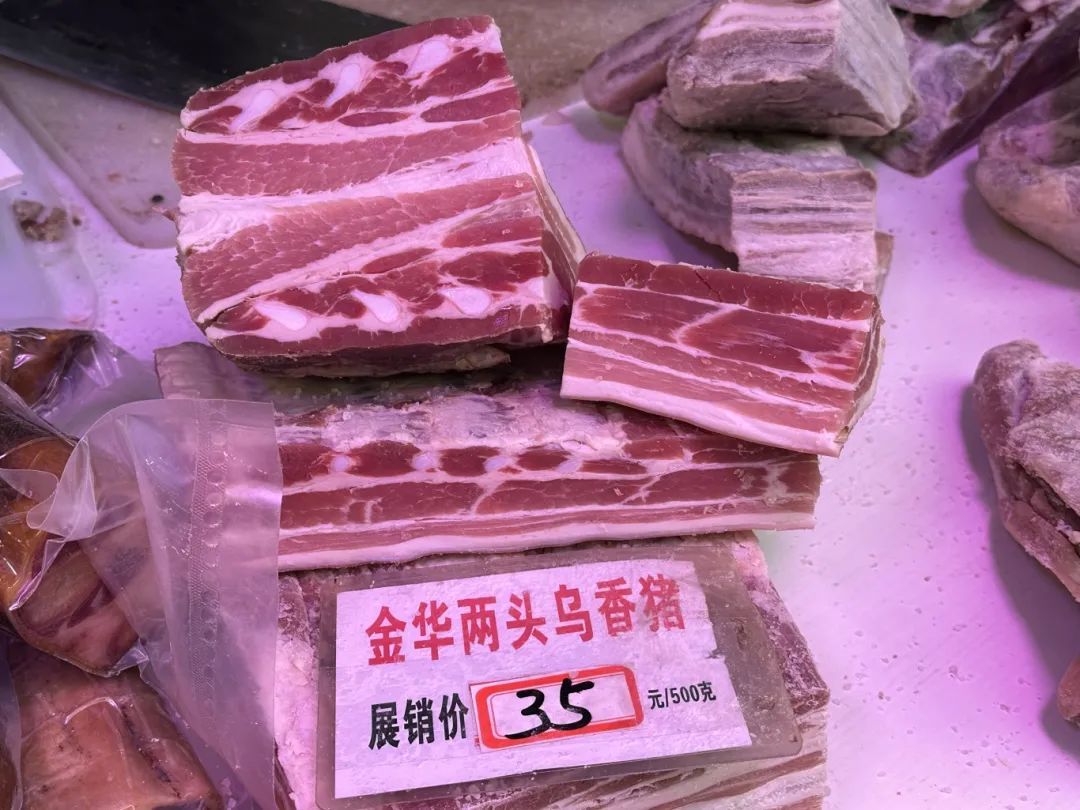 在金华咸肉摊位,浓郁的肉香引人驻足。摊主说,“这是来自金华的香猪咸肉,煮汤、烧菜饭都好吃。”