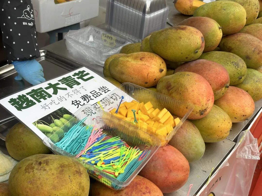 在越南芒果摊位,硕大的越南大青芒吸引了众多市民的目光。摊主介绍说:“这个芒果好吃不上火,皮薄肉厚,核小,过年送人特别有面子。”市民们纷纷驻足,打算选购一些作为年货。