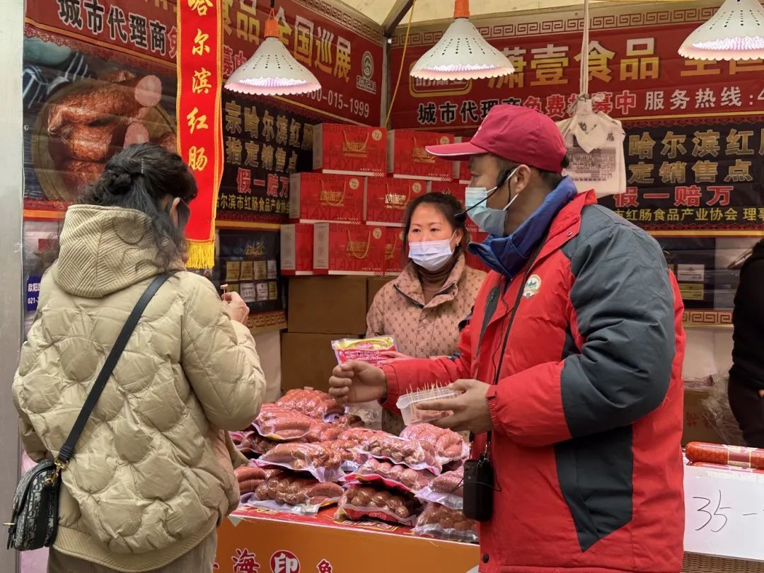 在哈尔滨红肠摊位,果木熏烤的猪肉香肠吸引不少市民品尝,制作工序多达二十多种,是东北年夜饭上的必备菜品。一位品尝后的市民表示:“这种红肠比较原味,虽然没有那么鲜,但是味道很纯正。”