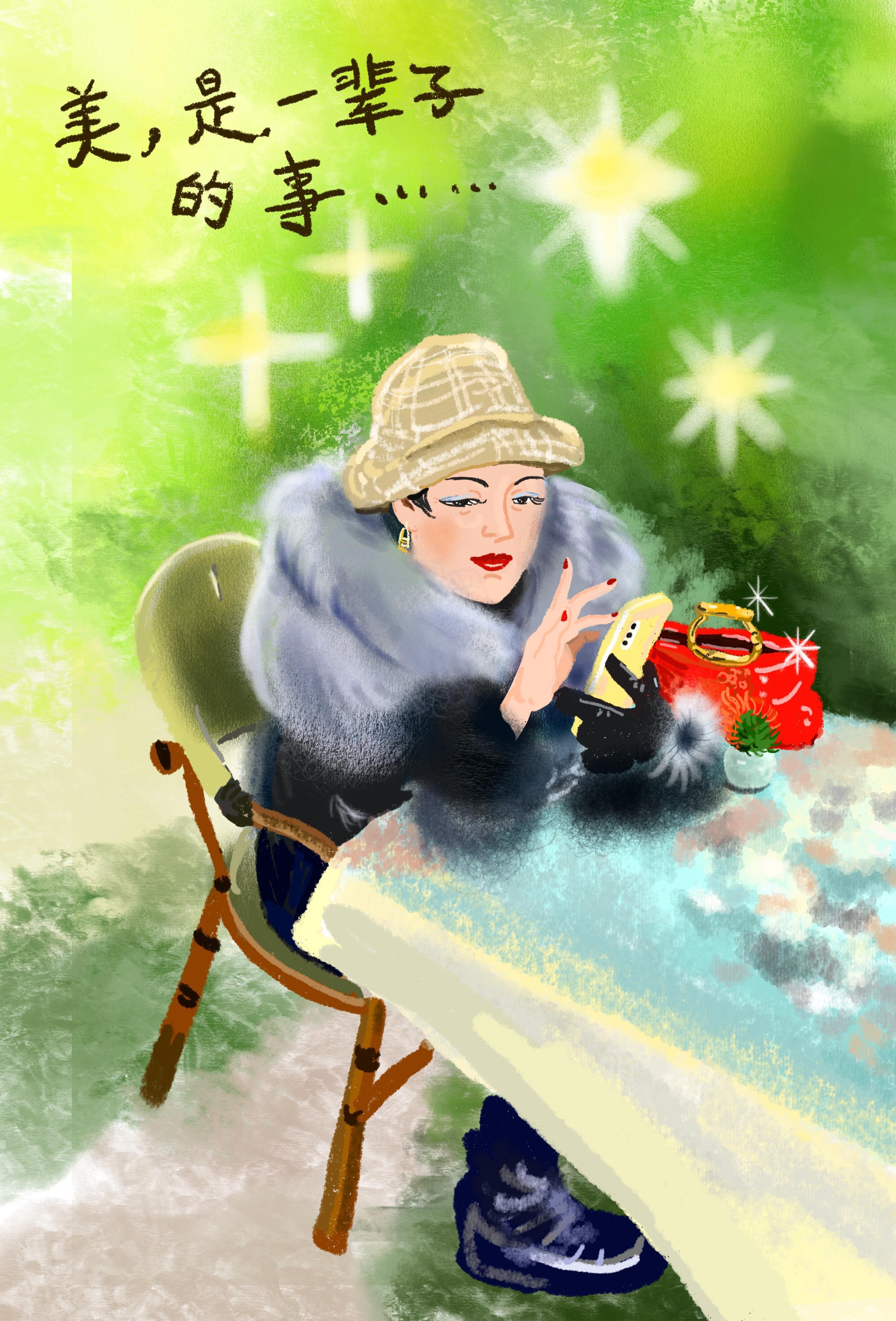 打扮入时的阿姨,羊毛帽、华丽的貂毛、精致的皮手套,复古的红色手提包宛如三十年代时装画报上的模特。翘着兰花指检验手机相册,美果然是一辈子的事。