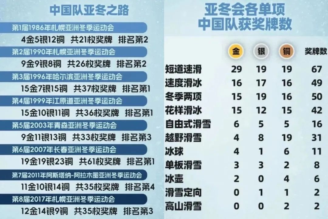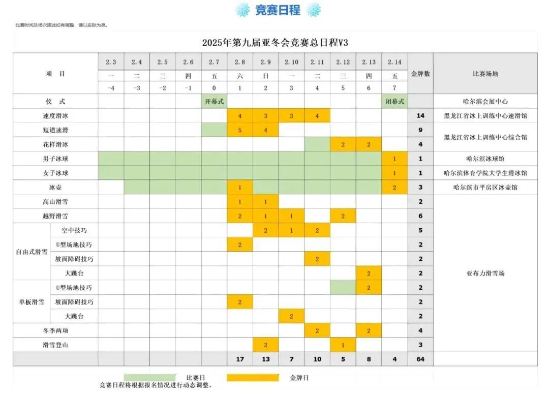 盼望着,盼望着 “亚冬会”的脚步近了 这里有30件“小事儿” 你应该知道 快跟着小体一起来看看吧 1 第九届亚冬会将于2025年2月7日至2月14日在黑龙江省哈尔滨市举行。 2 本届亚冬会的口号——“冰雪同梦,亚洲同心”。 3 吉祥物为东北虎“滨滨”和“妮妮”,寓意“哈尔滨欢迎您”。 4 “超越”是本届亚冬会的会徽。 5 本届亚冬会火炬主题为“澎湃”,寓意着本届亚冬会将充满活力与激情。 6 本届亚冬会奖牌“竞速精神”,正面融合赛道流线和会徽,展现出竞技体育的力与美。 7 本届亚冬会会歌《尔滨的雪》。 8 本届亚冬会办赛理念——绿色、共享、开放、廉洁;办赛要求——简约、安全、精彩。 9 本届亚冬会参赛国家和地区,以及运动员的数量有望创历届亚冬会之最。 10 本届亚冬会,中国体育代表团将派出170余名运动员全项参赛。 11 本届亚冬会共设置6个大项、11个分项、64个小项。 12 速度滑冰是本届亚冬会设立小项最多的分项,共14个小项。 13 滑雪登山是本届亚冬会新增大项,设立3个小项。 14 冰壶混合双人、自由式滑雪空中技巧双人同步是本届亚冬会新增小项。 15 本届亚冬会冰上项目集中在哈尔滨赛区。 速度滑冰比赛场地在黑龙江省冰上训练中心速滑馆; 短道速滑、花样滑冰比赛场地在黑龙江省冰上训练中心综合馆; 冰球项目比赛场地有哈尔滨体育学院大学生滑冰馆、哈尔滨冰球馆; 冰壶项目比赛场地在哈尔滨市平房区冰壶馆。 各比赛场馆 16 本届亚冬会雪上项目集中在亚布力赛区,比赛场地都在亚布力滑雪场。 亚布力滑雪场 17 现场观看比赛可采取线上、线下购票等方式。 18 2月4日的冰壶混双循环赛,将是中国体育代表团在本届赛事的首次亮相。 19 本届亚冬会开幕式将于2月7日晚上8点在哈尔滨会展中心举办。 20 2月8日上午将进行短道速滑混合团体2000米接力、自由式滑雪U型场地技巧和冰壶混双这三项决赛,本届亚冬会首金可能在这三个项目中产生。 21 2月8日是产生金牌数量最多的一天。 22 2月14日闭幕式当天,还要决出冰球和冰壶的最后几项冠军,共产生4枚金牌。 竞赛日程 23 哈尔滨已是第二次举办亚冬会,上次是在1996年。 1996年第三届亚冬会开幕式 24 1996年哈尔滨亚冬会,中国体育代表团以15金7银15铜的成绩列金牌和奖牌榜榜首。 25 中国体育代表团在历届亚冬会已累计获得94金。 26 亚冬会历史上获得金牌数最多的中国运动员是杨扬,连续三届亚冬会参赛,共获得短道速滑项目7枚金牌1枚银牌。 杨扬 27 亚冬会期间,哈尔滨气温可能降到零下20摄氏度。 28 如需观赛,帽子、耳罩、围巾、手套、羽绒服等保暖用品不能少。 29 提前订好出行方式和酒店,注意天气,为出行做好备案。 30 哈尔滨旅游打卡景点——中央大街、冰雪大世界、索菲亚教堂等,游玩前要做好攻略。 期待在亚冬会期间 体验更加多姿多彩的“尔滨” 也期待中国体育代表团 赛场上的精彩表现 文:王前 图:新华社、新华体育、 中国体育图片、哈尔滨亚冬会官网 来源:中国体育报 编辑:厉苒苒、江妍 审核:叶蕙心 点击上图小程序 小体推荐 2025年来了,请接收来自上海市市长的新年祝福! 2025年上海市体育工作会议召开 运动,让你感知这座城的奔腾活力——上海加快打造全球著名体育城市 体荟四季|应季去旅行,月月有花样!2025玩转长三角计划 跟着地图去打卡|足球爱好者的天堂——上海市民体育公园·足球公园 为一场赛事赴一座城!2025年,跟着赛事游上海 小体声明 由于条件所限,可能出现未署名的原创图片或文字,在转载之前无法与权利人联系授权及稿酬事宜。欢迎权利人与编辑部联系署名授权、稿酬等事项。联系邮箱:shtyxxy@126.com