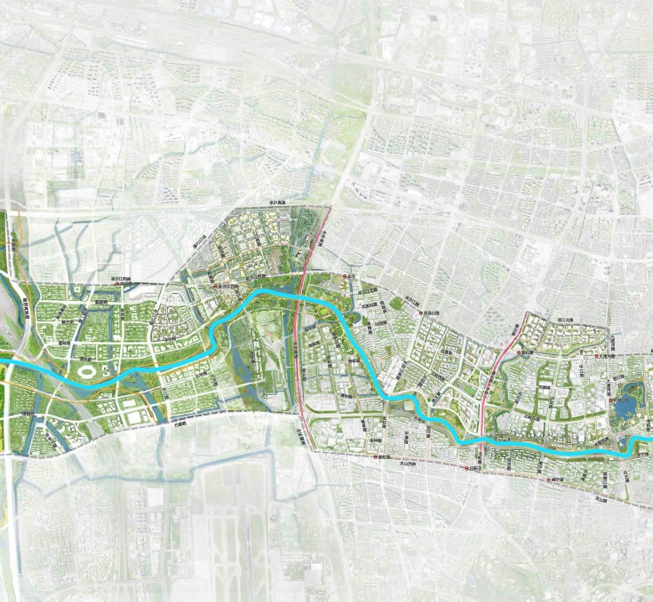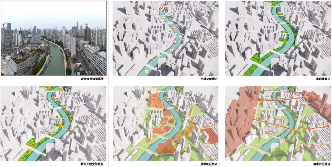 此次专项规划的规划范围涉及河域约33公里,其中外环内21公里,按照覆盖南北方向的腹地深度不同,规划划定了亲水区、滨水区、统筹区三个层次的规划范围。此次规划中,特别提出了“横向分层”的提升策略,即以河为中心,由内向外分为水域、水际线、临水开放空间、亲水街区和滨水片区五层空间,并进行差异化设计。