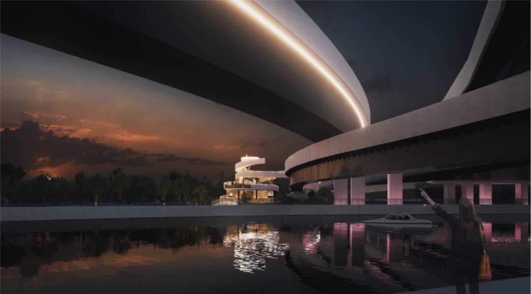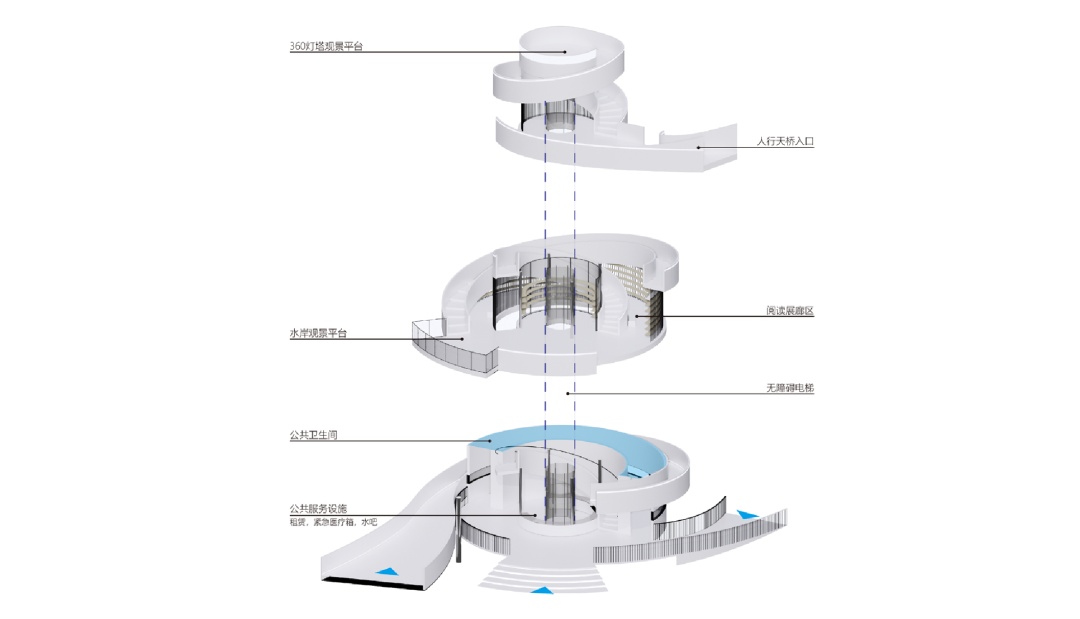 消防廊道连接中环人行辅道、苏河沿岸步道和光复西路,起到人行交通与疏散的作用,观景廊道则连接观景平台和沿岸步道。而在体块拉升并衔接各个空间的过程中,建筑也自然而然形成了三层空间。